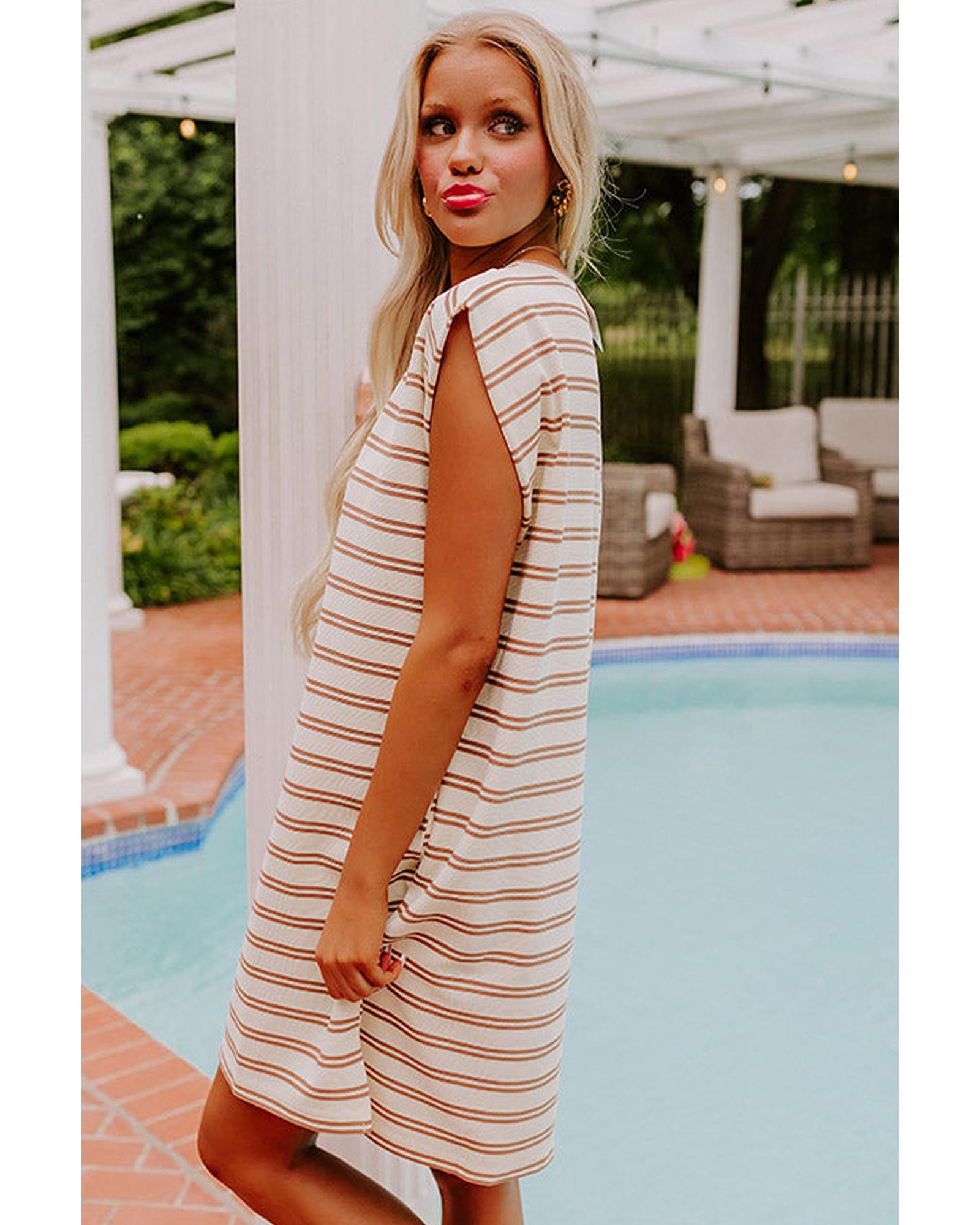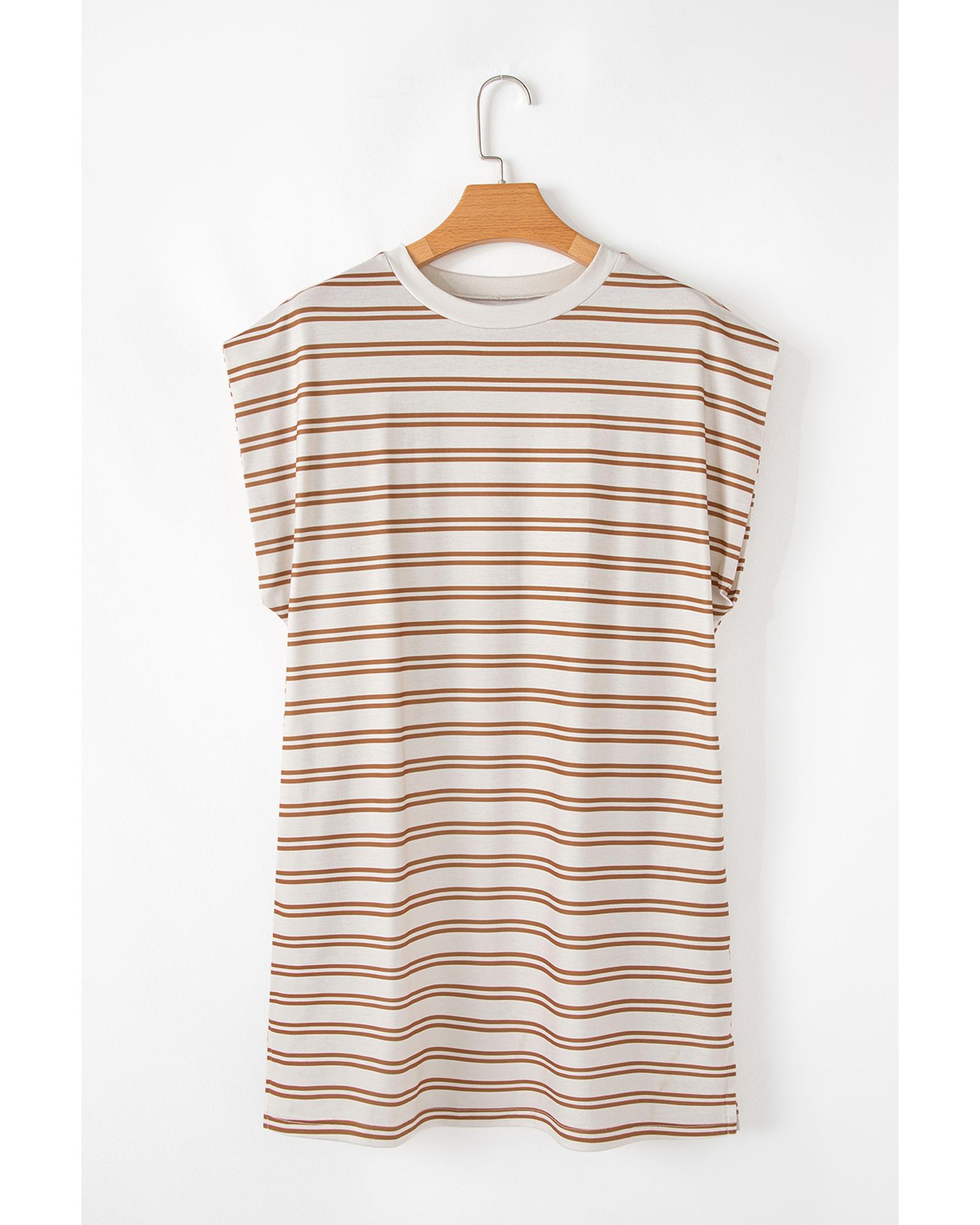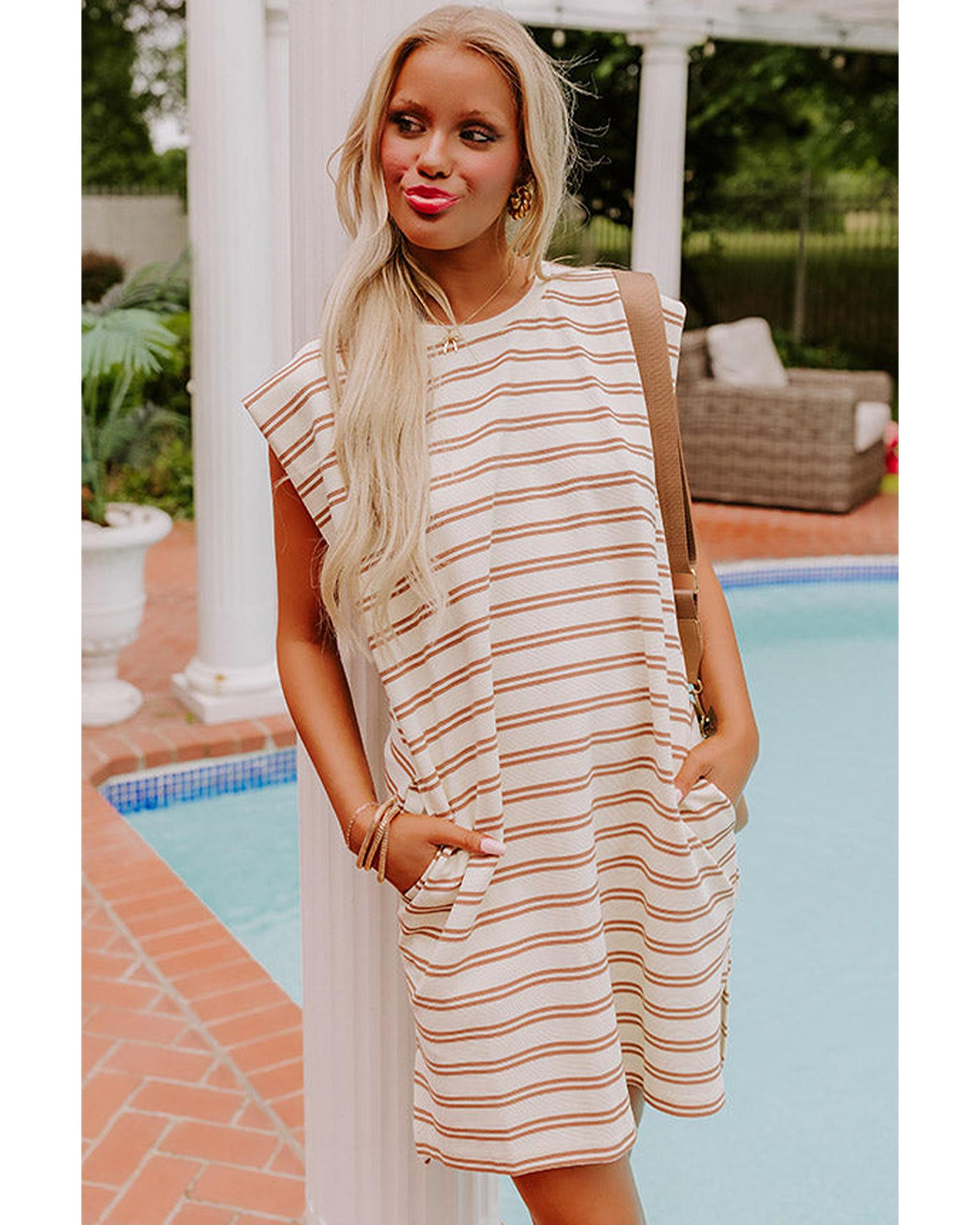 Khaki Stripe Round Neck Sleeveless Casual Pocketed Mini Dress – S