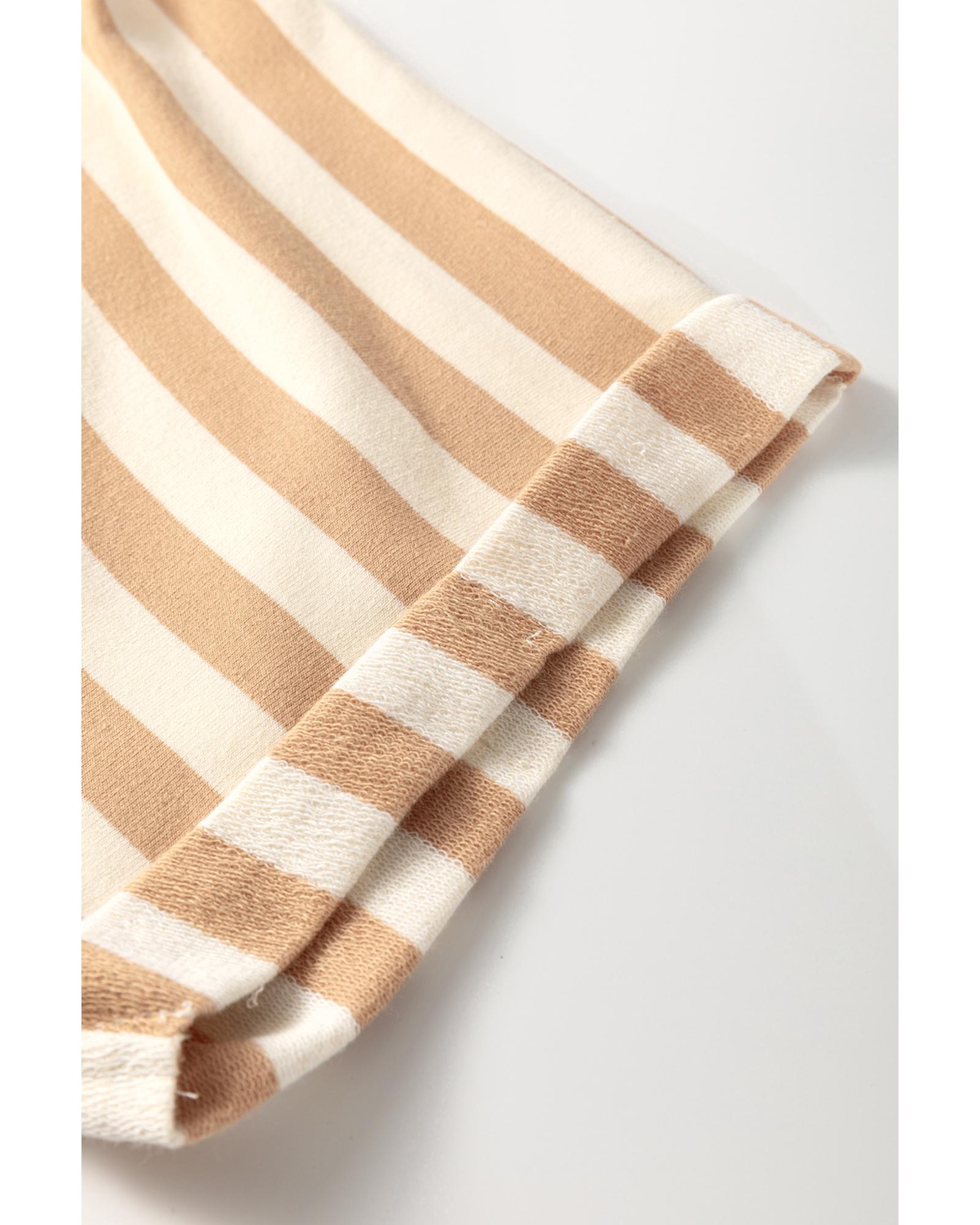 This khaki stripe mini dress features a versatile two-in-one design with a collared neckline and patchwork detailing, offering a stylish and modest look. The raglan sleeves with folded edges add a casual touch, while the loose fit ensures comfort and ease of movement.
