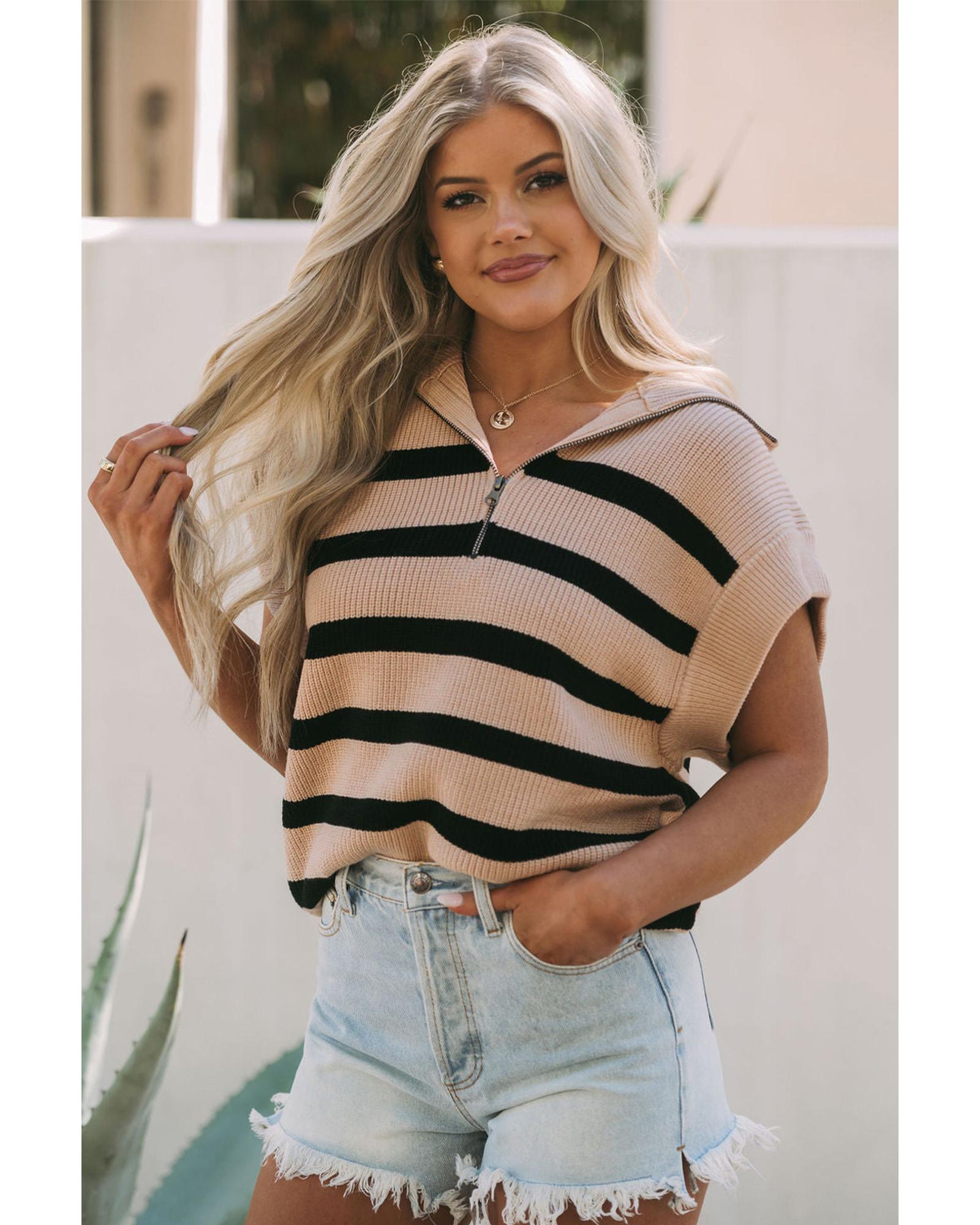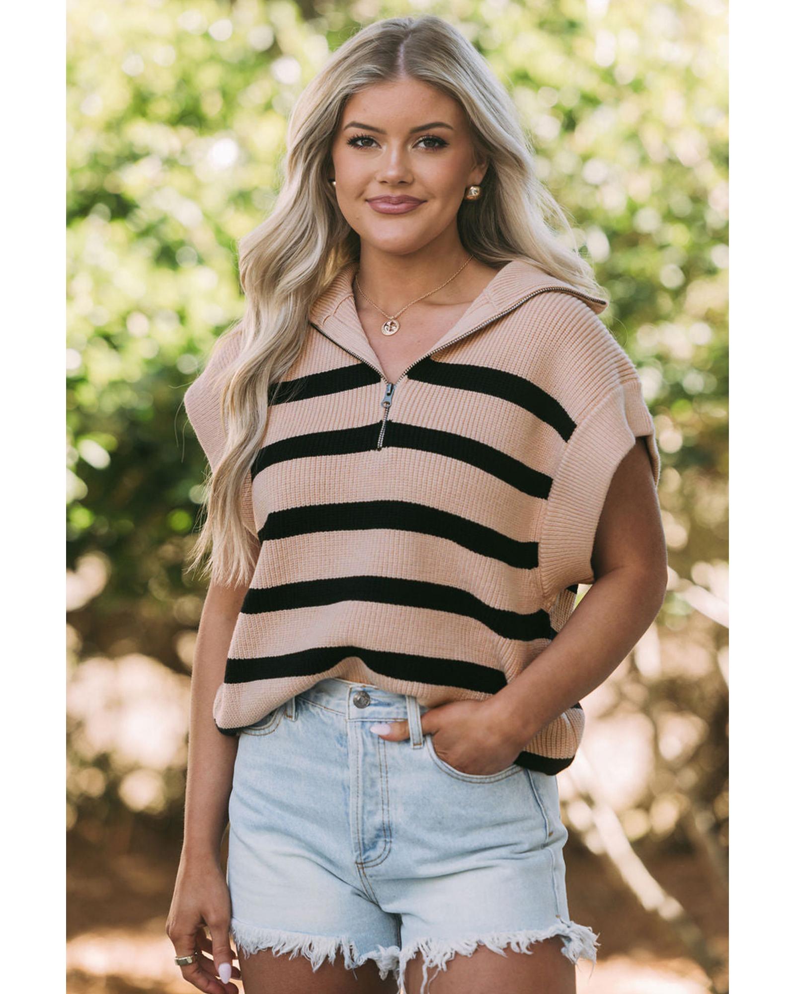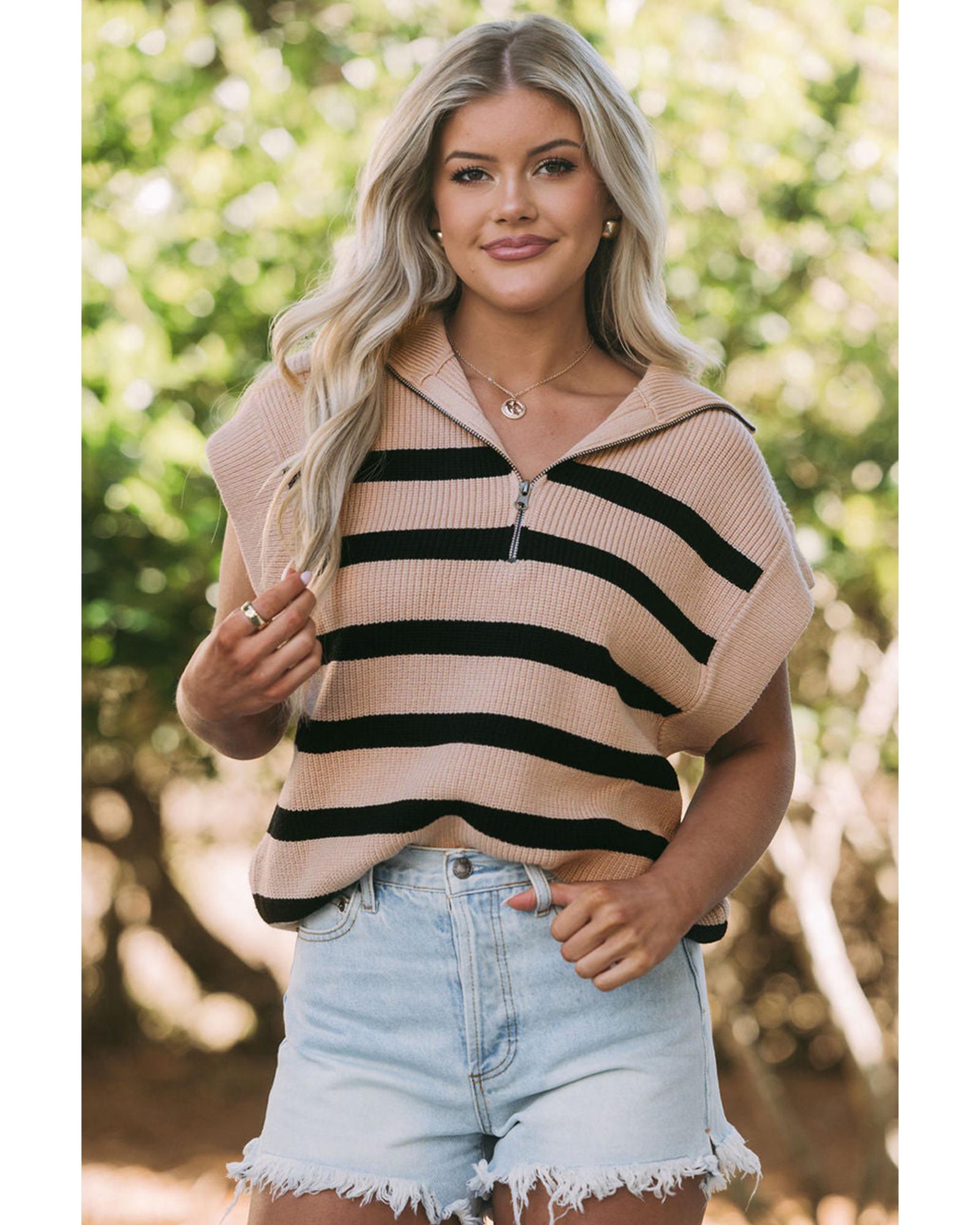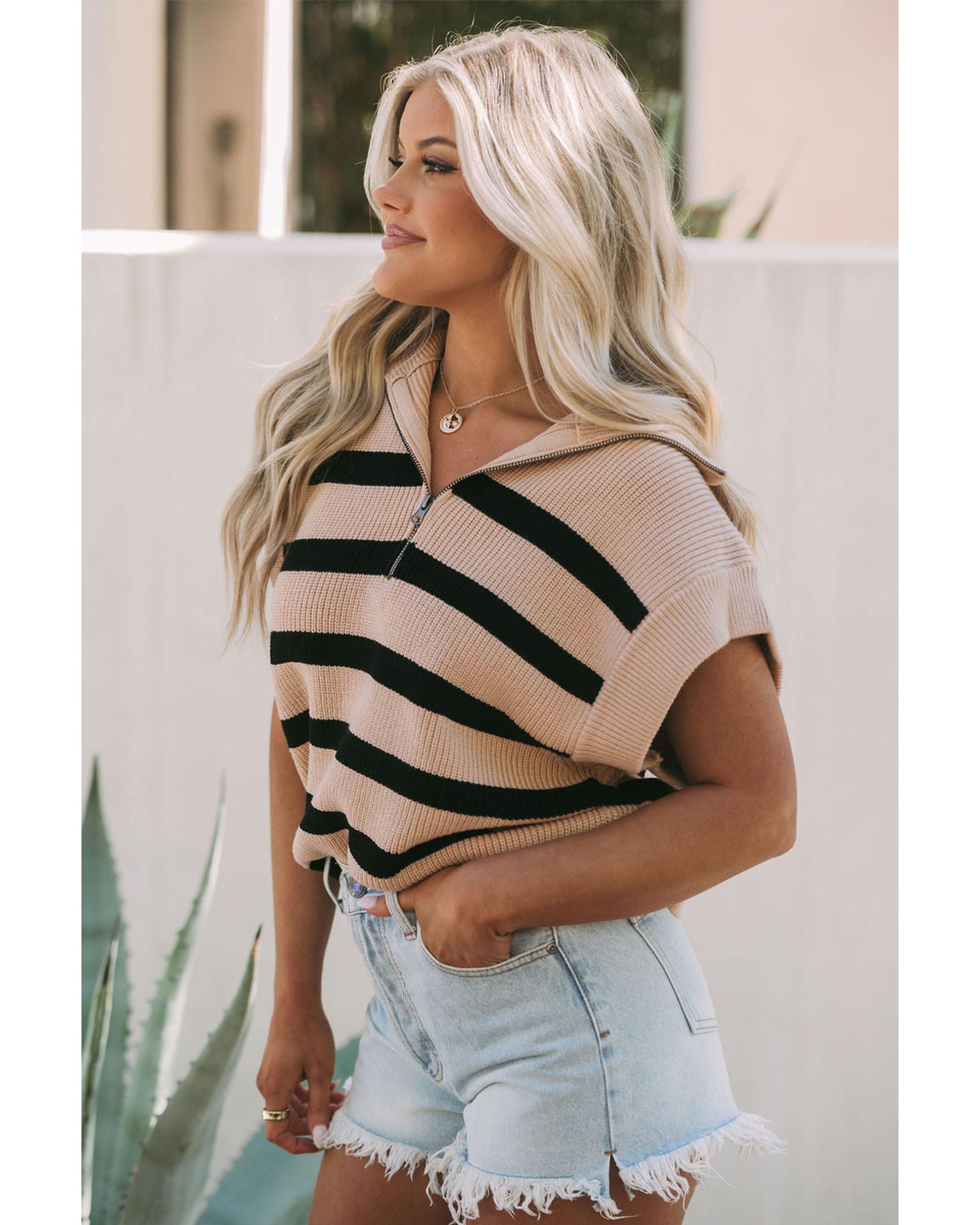 This short sleeve sweater features a stylish zipped collar and a classic striped pattern, making it suitable for both casual and elegant warm-weather occasions. Designed with a trendy fitted look, it offers a versatile and timeless style that can be easily paired with various outfits.
