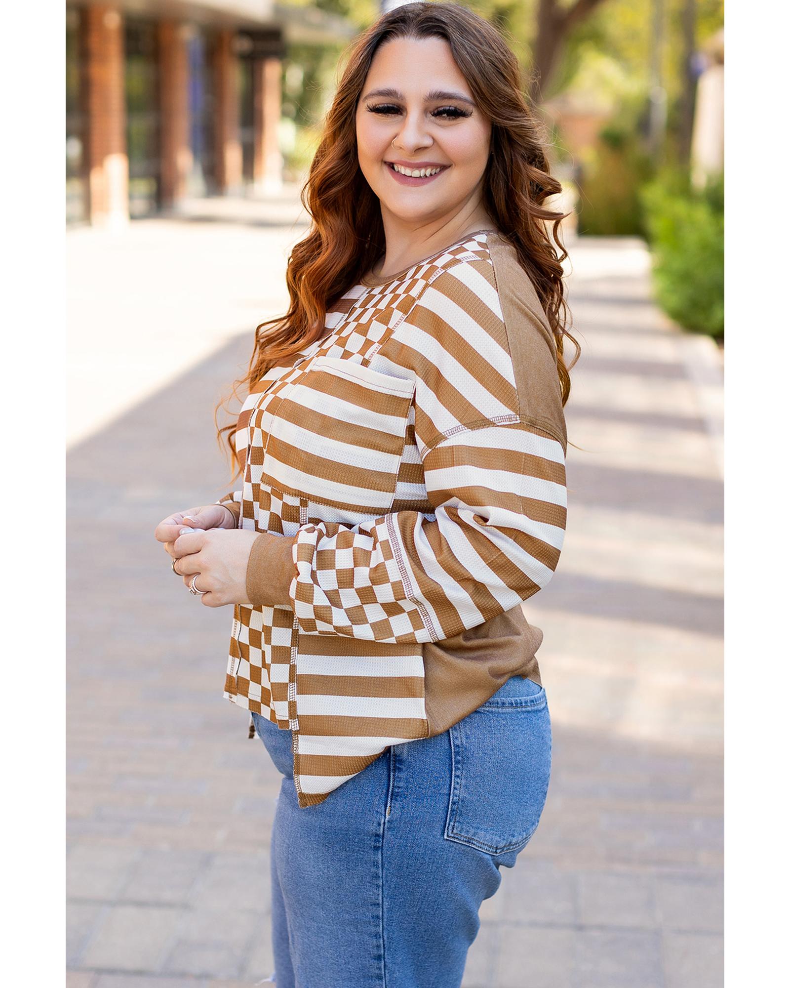 This casual top features a stylish khaki striped checkered mixed print design with a practical chest pocket. It offers a relaxed fit suitable for plus size wearers, combining comfort and versatility for everyday casual outfits. The top is made from high-elasticity polyester fabric, ensuring a comfortable and flexible fit.