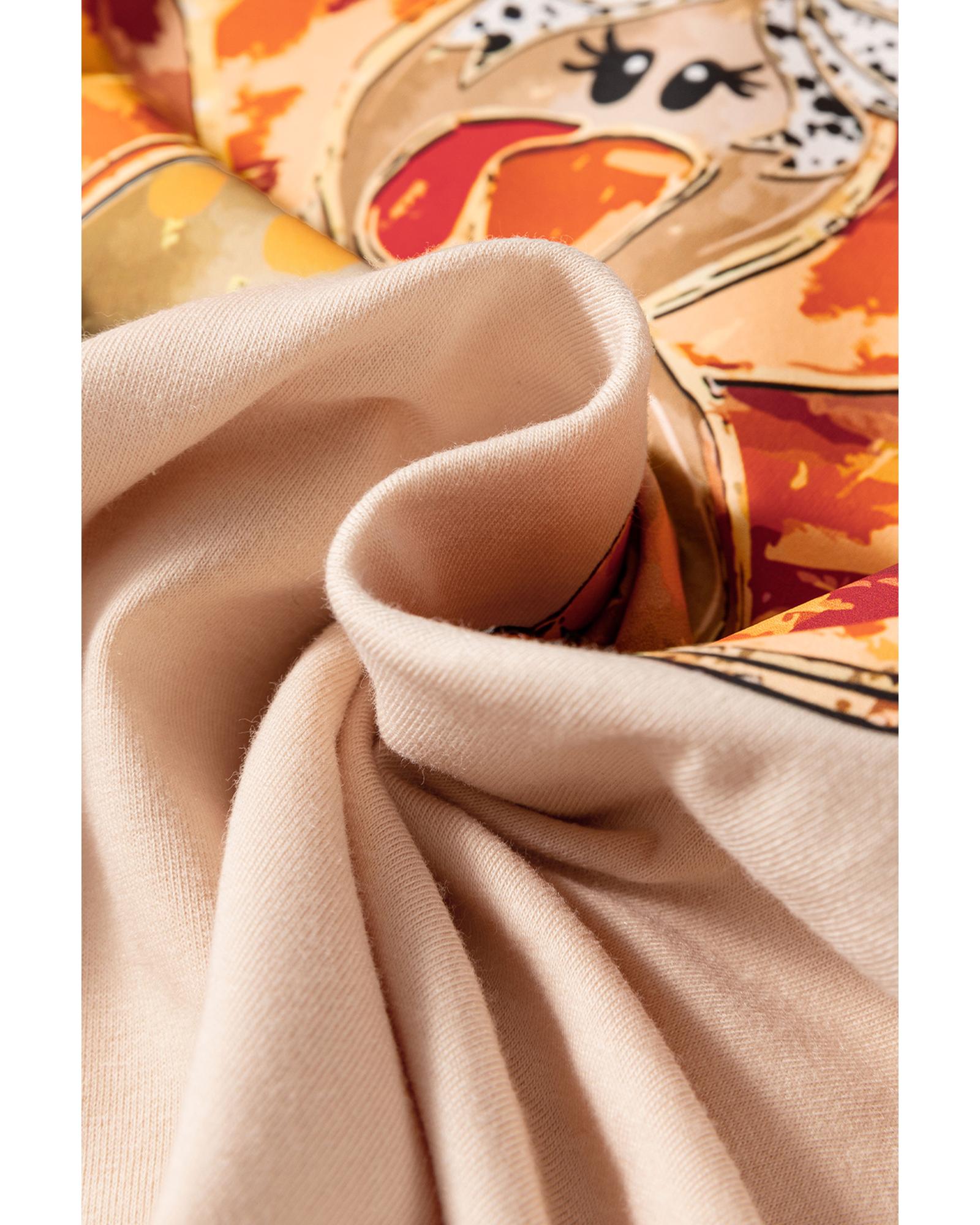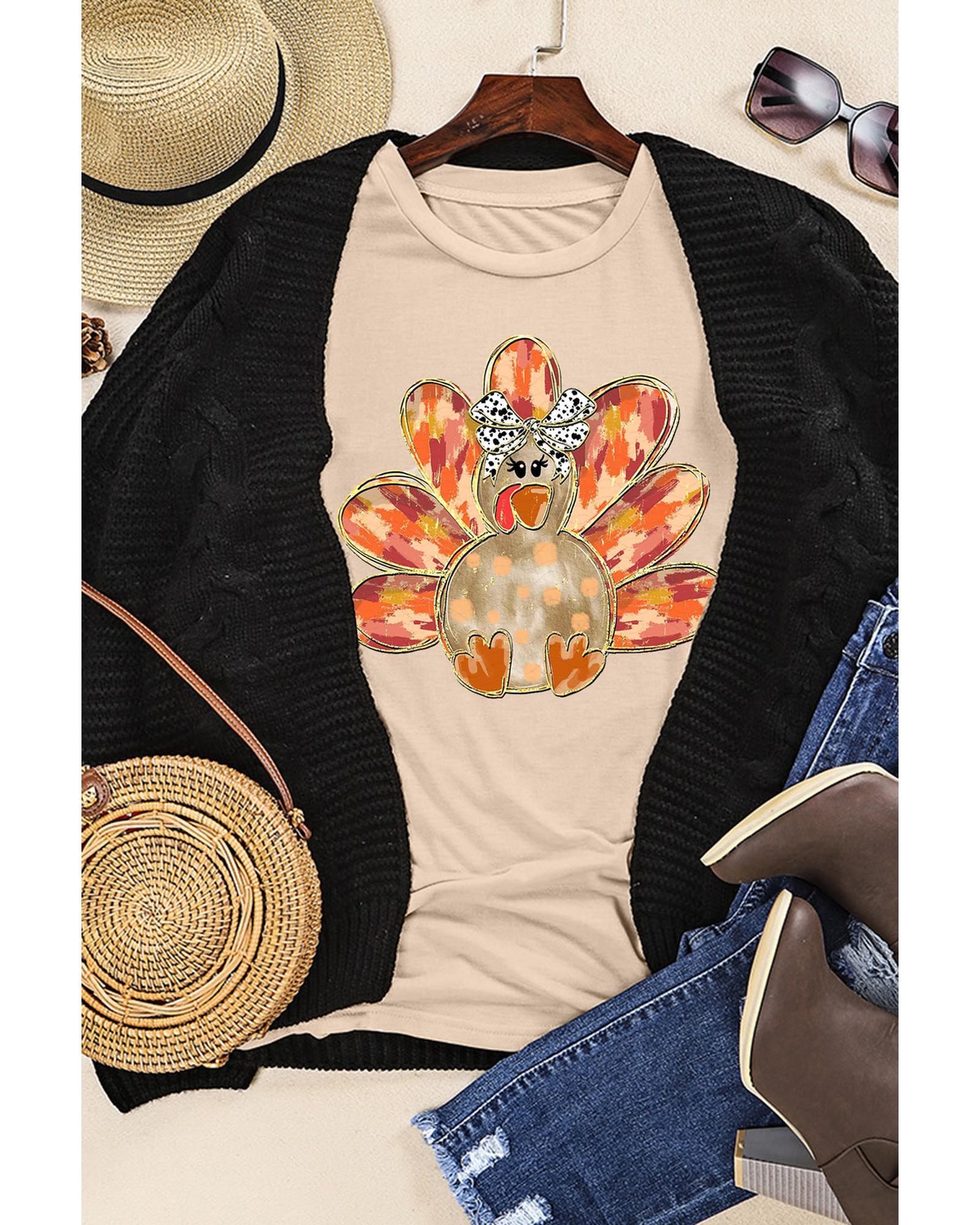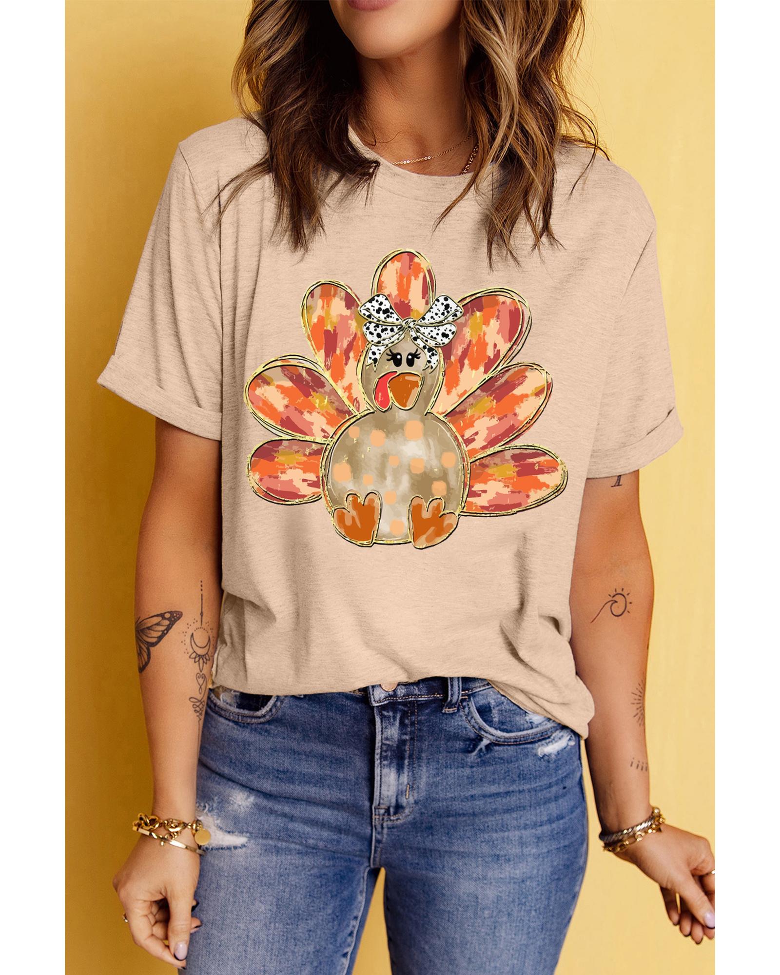 This crewneck tee features a khaki color with a festive Thanksgiving turkey graphic adorned with a bowknot. Designed with a relaxed fit and a crewneck style, it offers a comfortable and trendy look suitable for holiday celebrations.