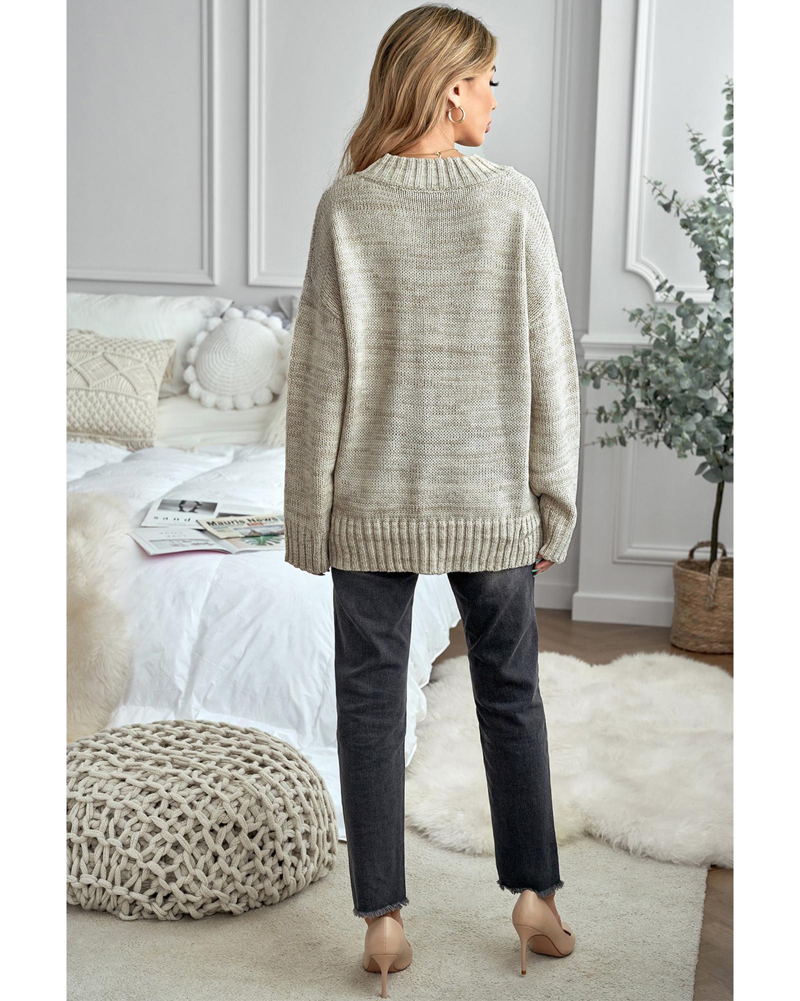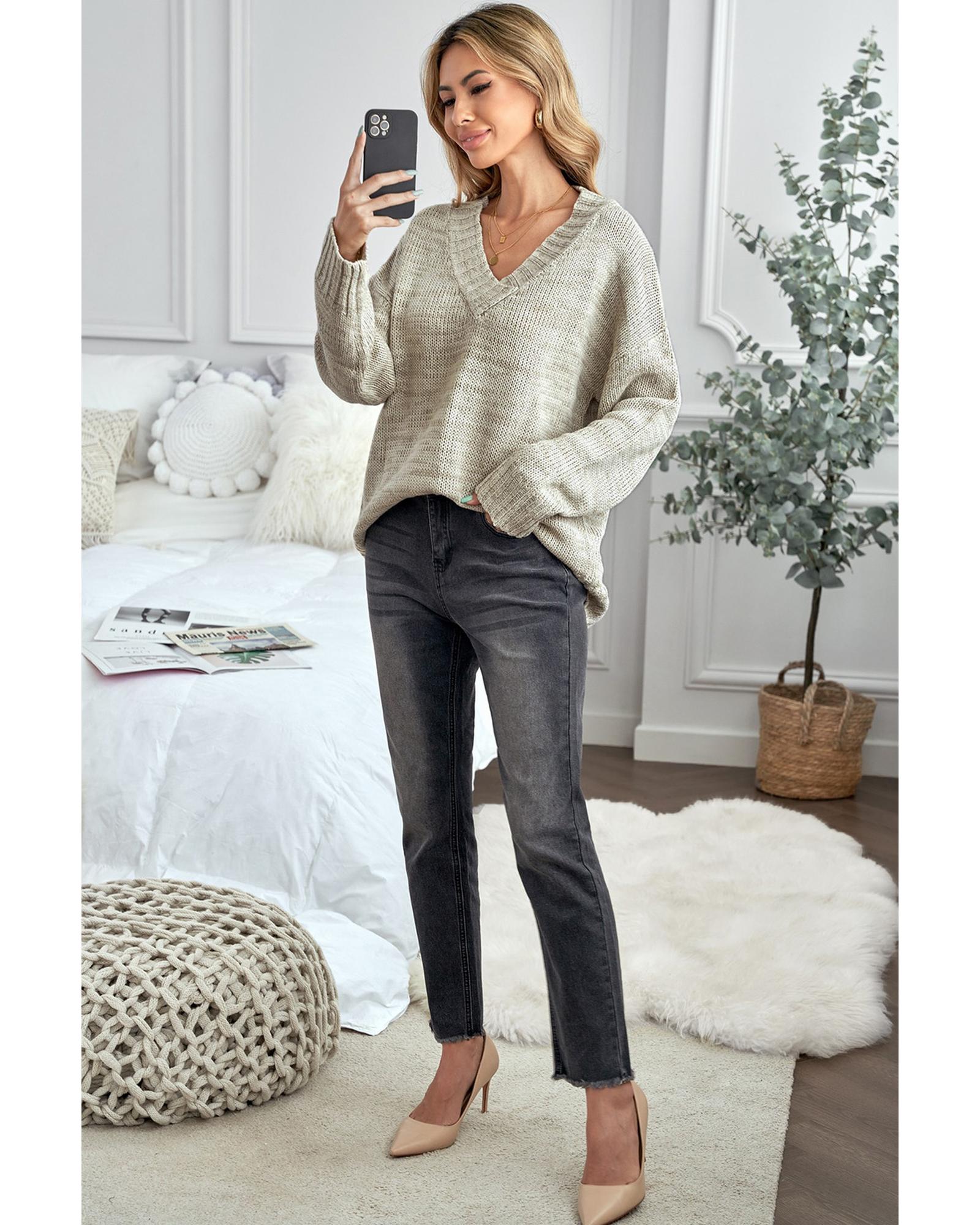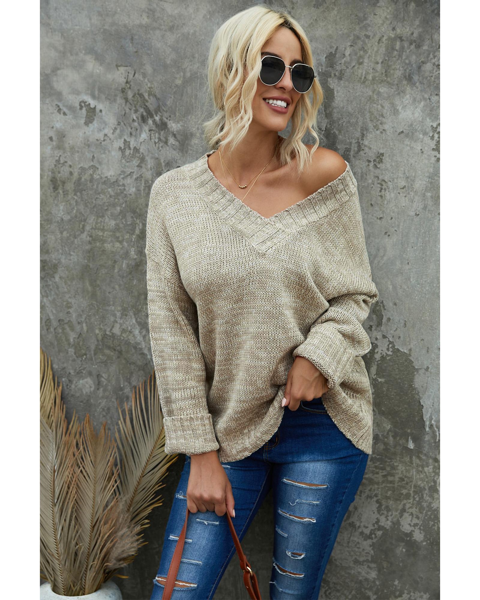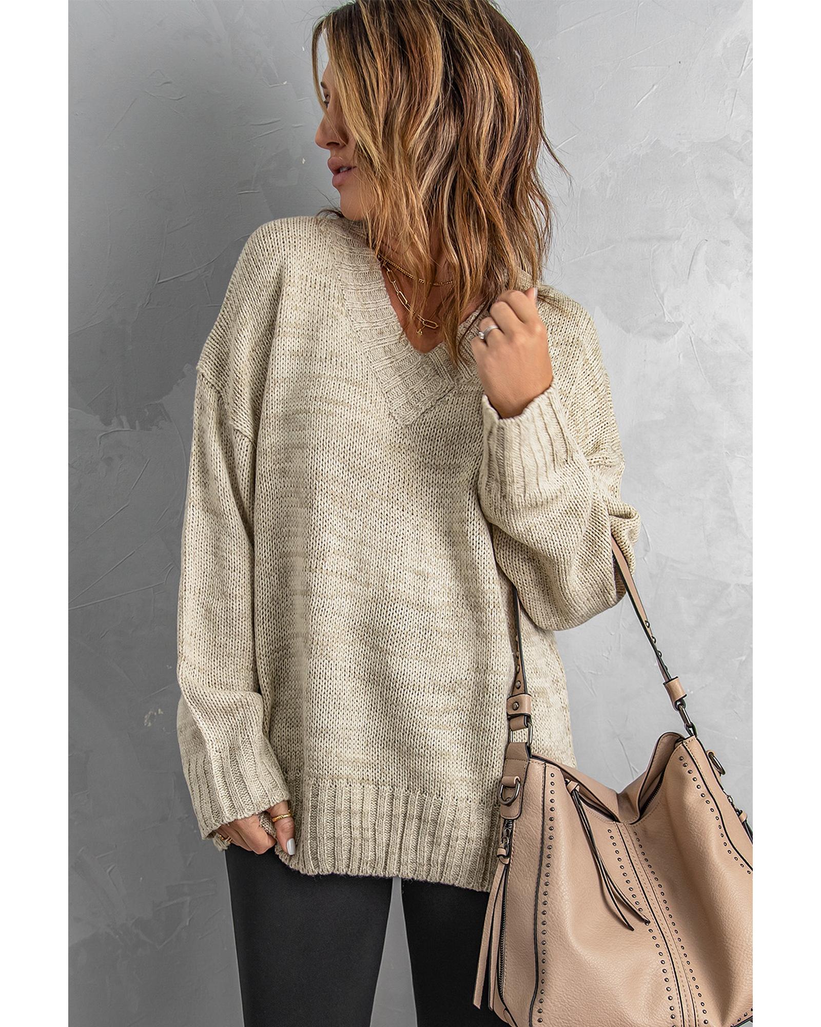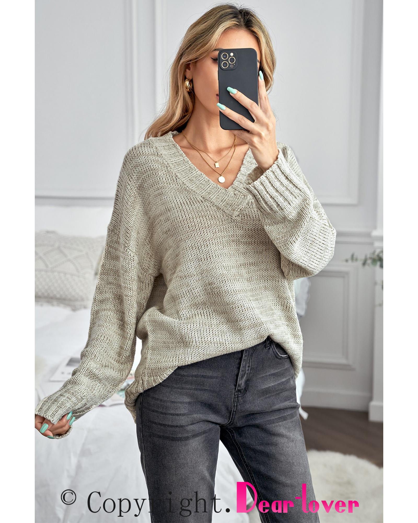 This knitted sweater features a trendy fitted design with a deep V neckline and a relaxed drop shoulder style. Its versatile solid color makes it suitable for various occasions and easy to pair with different outfits, making it a great choice for cold weather wear.