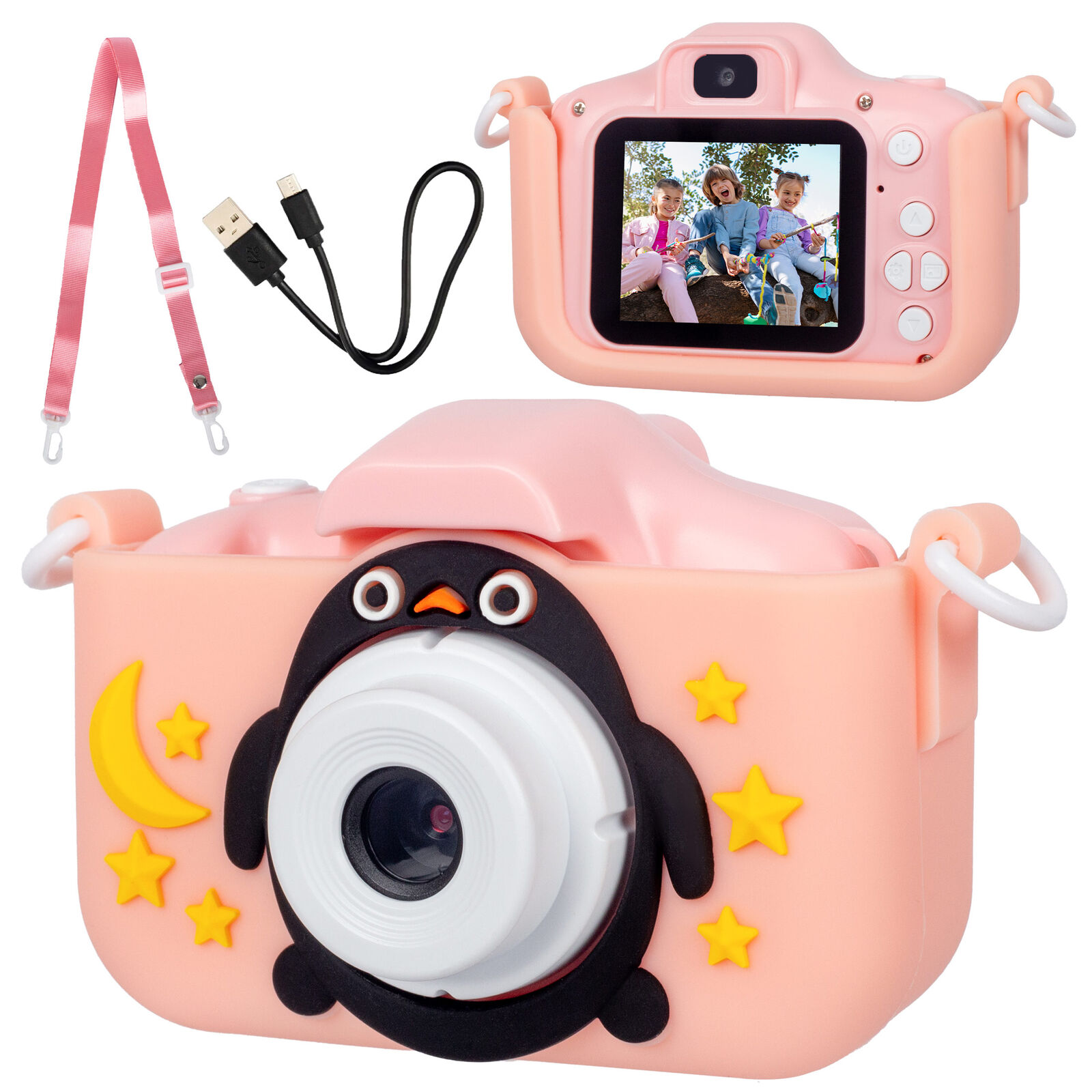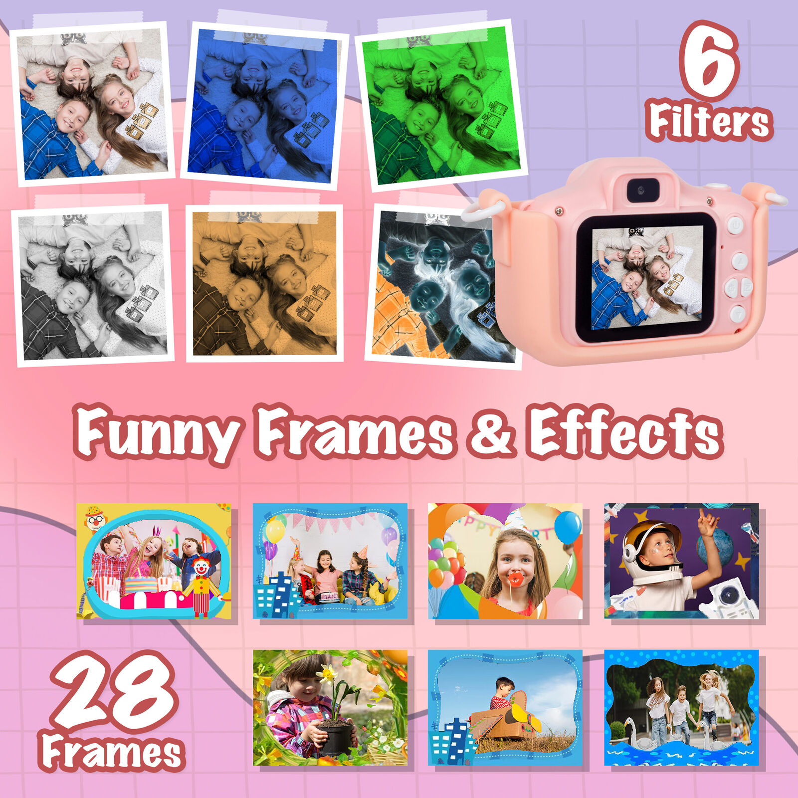 This kids digital camera features dual lenses, allowing children to take photos from both front and rear perspectives. It offers HD video recording with 4x digital zoom, a bright 2.0-inch screen for easy viewing, and fun creative options with filters and frames. The device includes built-in games, supports external storage via micro SD card, and is powered by a rechargeable battery with USB Type-C charging for convenience.