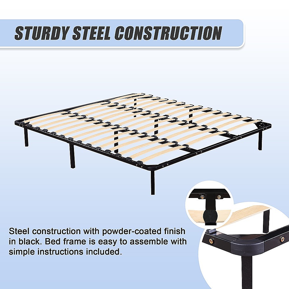 This king-sized bed frame combines modern design with durability and affordability. Made from sturdy steel with a sleek black finish, it offers a neutral and sophisticated look that complements various bedroom decors. The frame is easy to assemble and disassemble, making it convenient for setup and storage.
