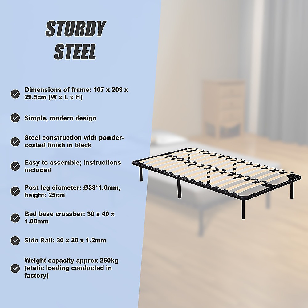 This metal bed frame is designed to provide a sturdy and stylish foundation for a king single-sized mattress. Its modern design and neutral black finish make it suitable for various bedroom decors. The frame is easy to assemble and disassemble, making it convenient for setup and storage.