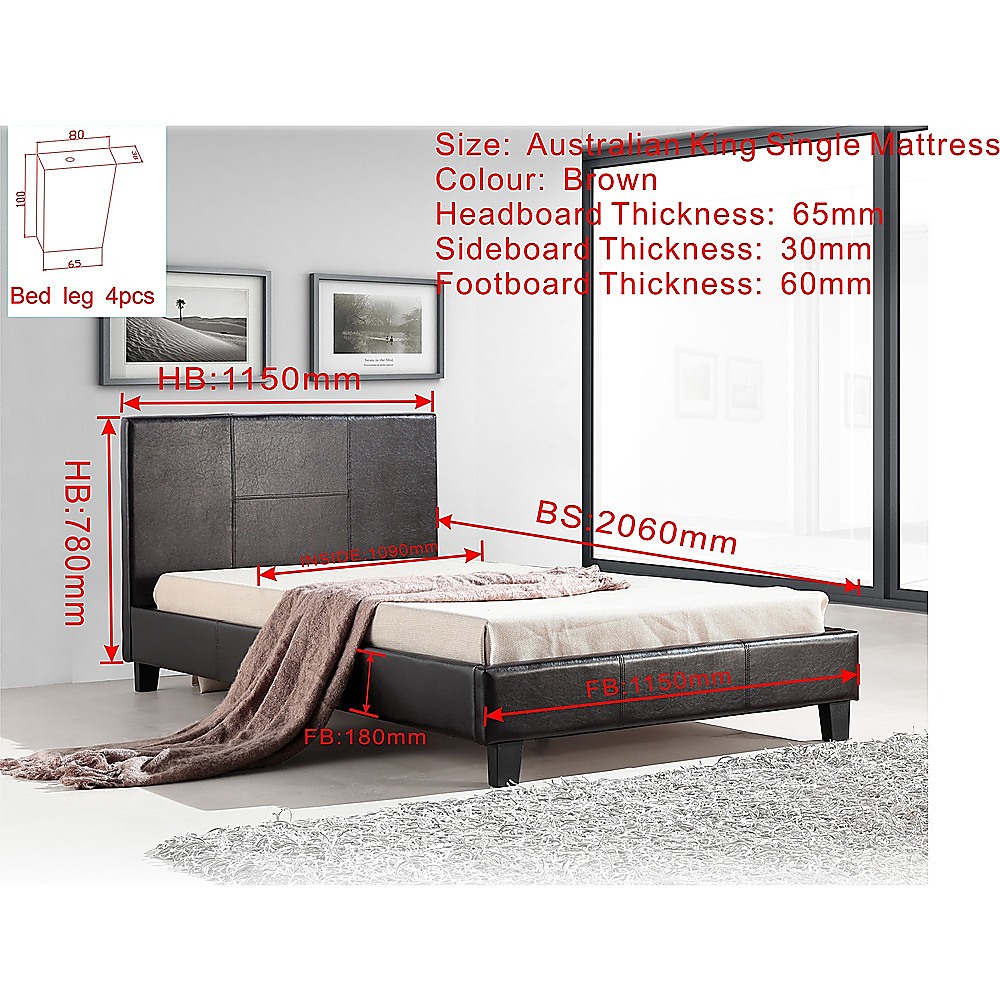 This king single bed frame features a stylish design with a durable PU leather covering, making it a practical addition to any bedroom. It is designed to fit a standard Australian king single mattress and provides a sturdy and comfortable sleeping platform. The all-wood construction ensures stability and support, while the padded headboard offers extra comfort for sitting up and relaxing. Its clean lines and brown color add a modern touch to your decor.