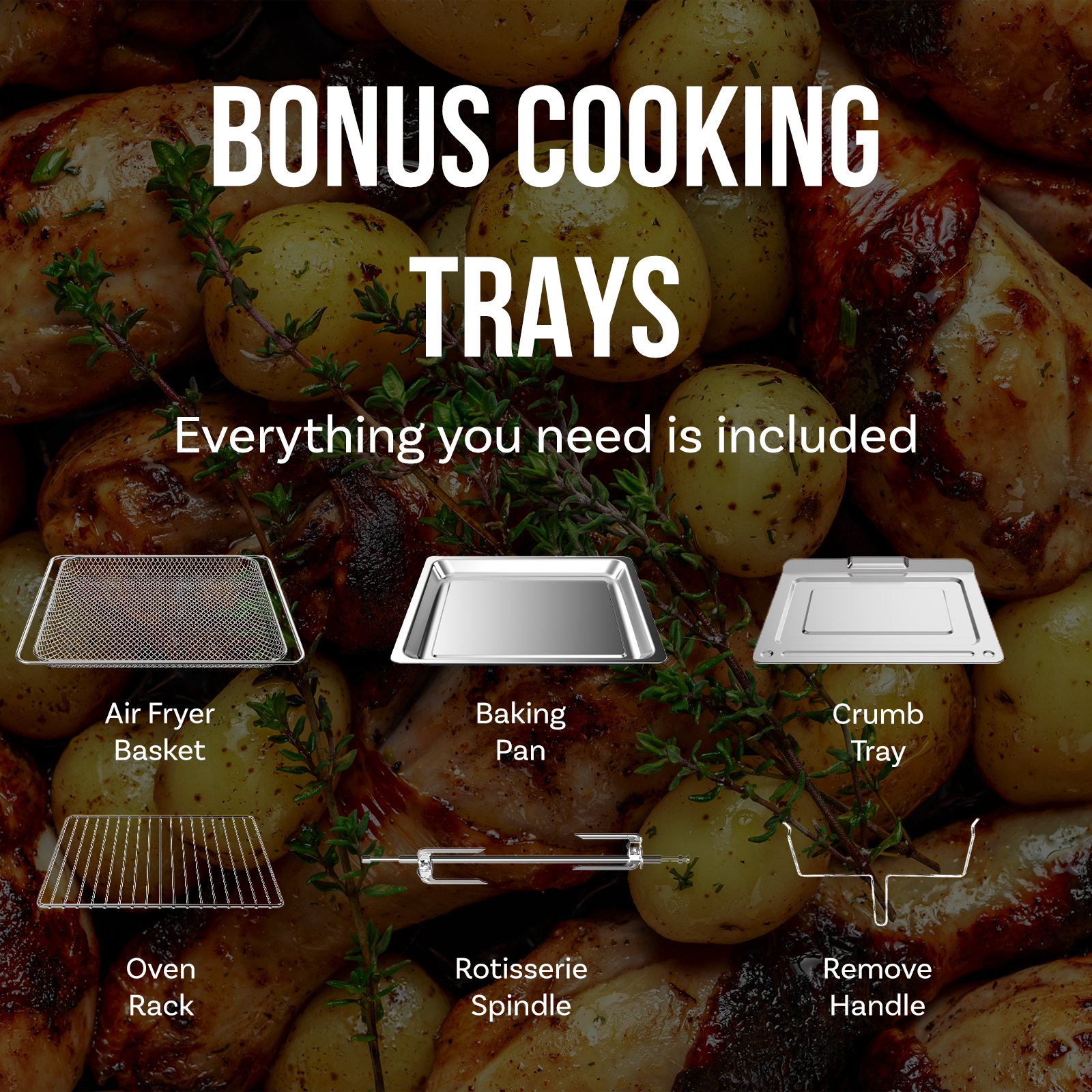 • Includes 6 bonus accessories: oven rack, baking pan, air fry basket, crumb tray, rotisserie, and remove handle
