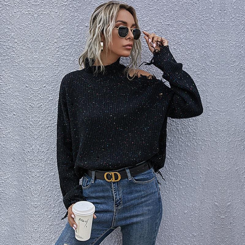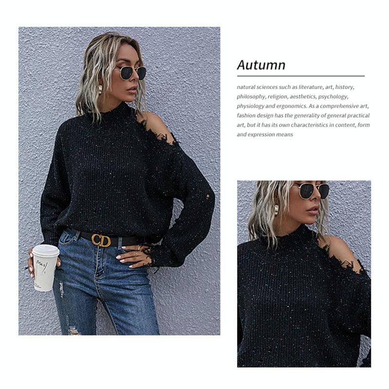 This autumn knitted sweater features a loose, off-shoulder design with ripped details, offering a casual and stylish look. Made from soft and stretchy fabric, it provides comfort and warmth, making it suitable for daily wear, casual outings, and vacations. The turtleneck design adds extra warmth for colder seasons, and it pairs well with jeans for a fashionable appearance.