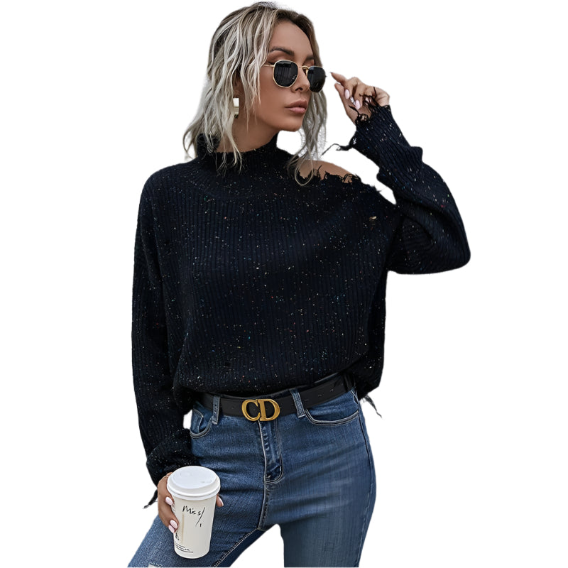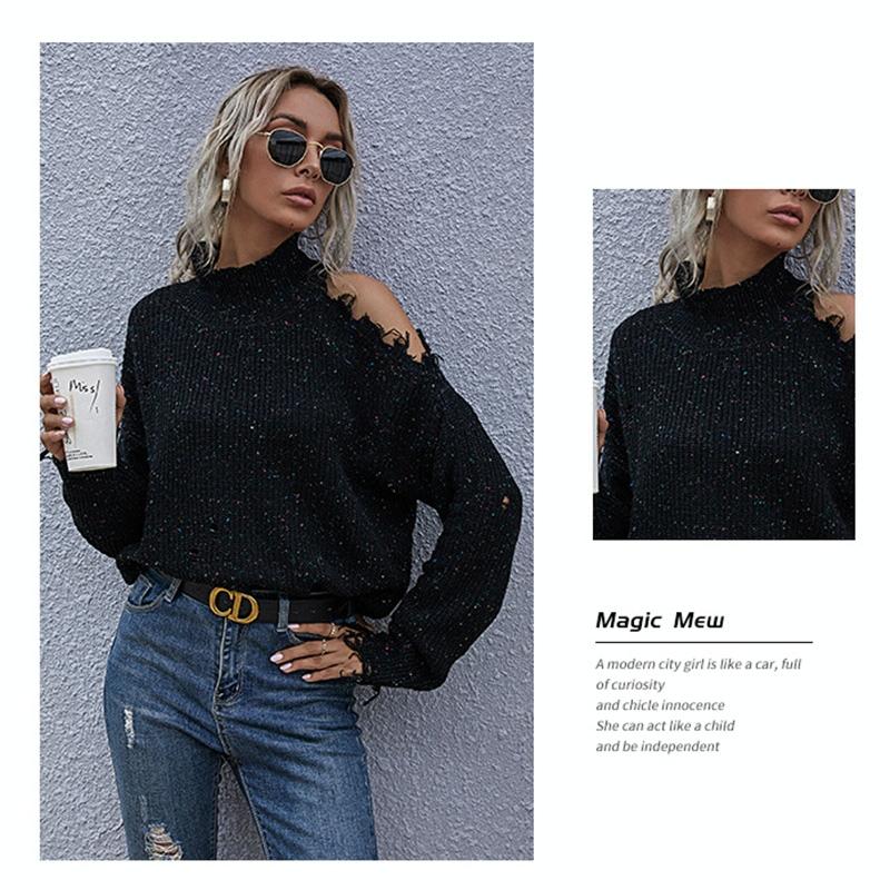 This autumn knitted sweater features a relaxed off-shoulder design with ripped details, long sleeves, and a turtleneck for added warmth. Crafted from soft and stretchy fabric, it offers a comfortable fit suitable for casual outings, daily wear, or vacations. Its versatile style pairs well with jeans for a fashionable look during the cooler seasons.