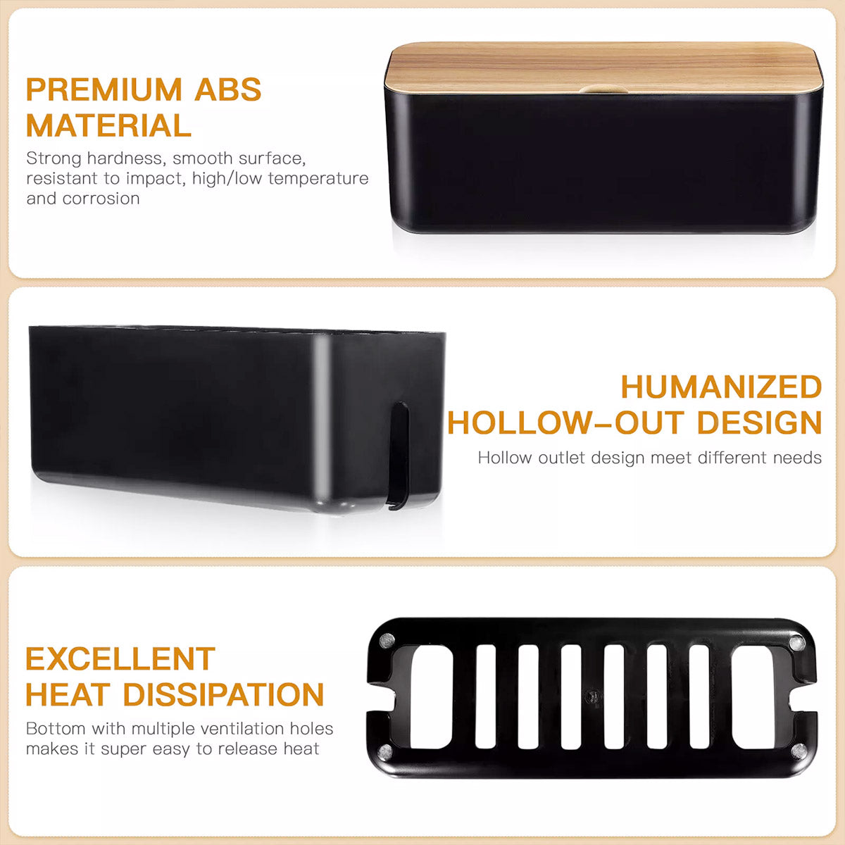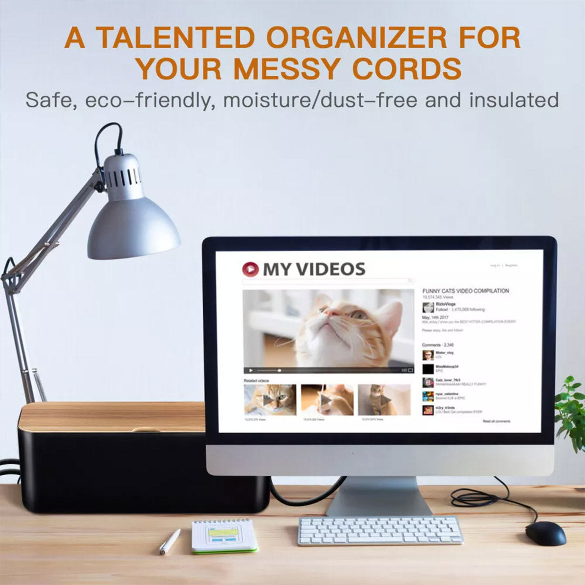 This cable storage box provides an organized and clutter-free workspace by managing power strips, wires, and cords. Its modern design features a wood-style lid that complements various home or office decors, offering both functionality and aesthetic appeal.