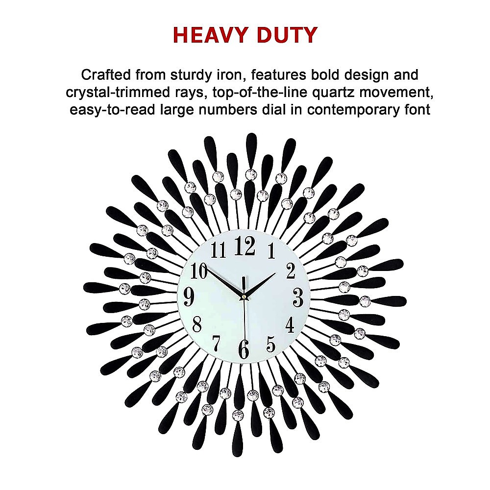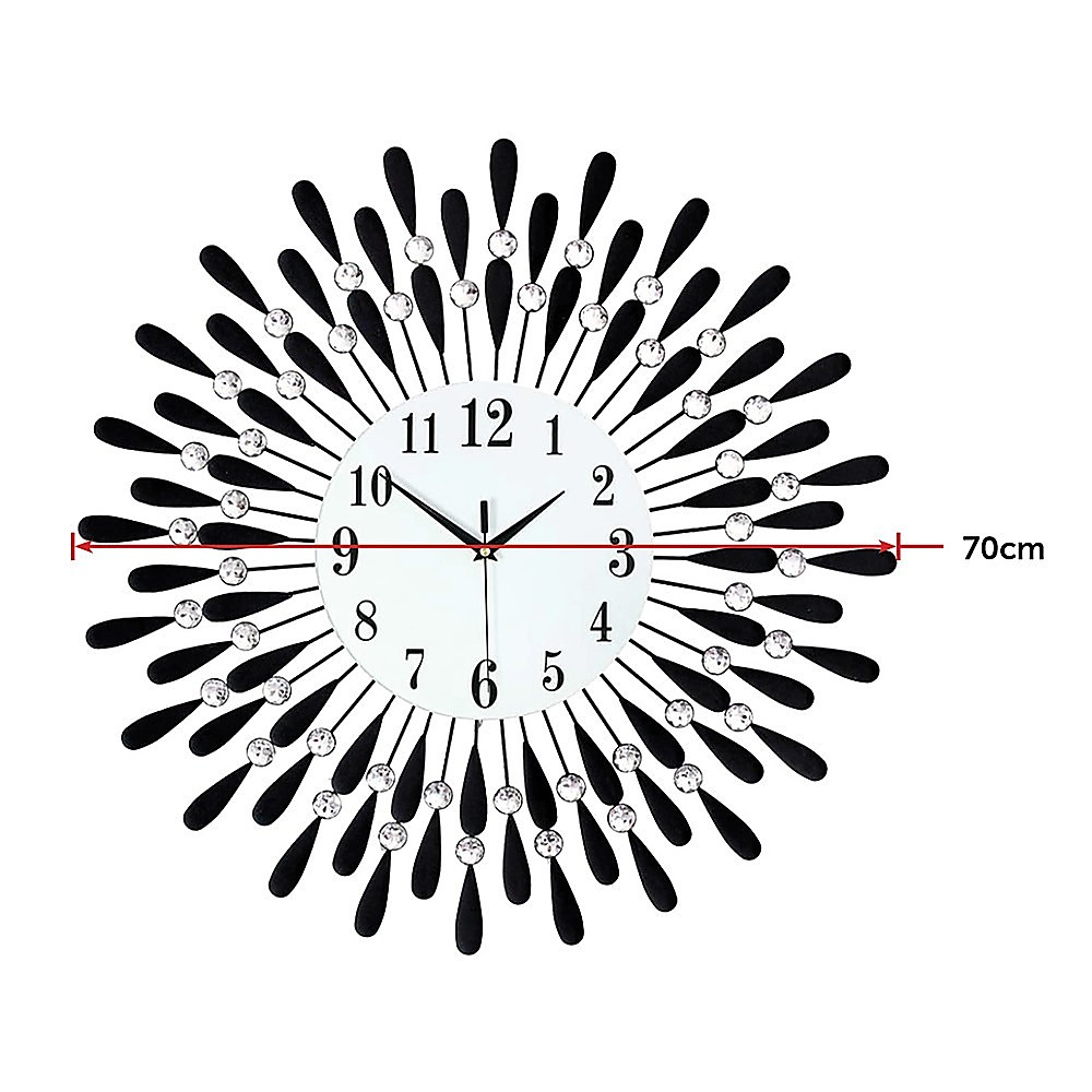 This large modern 3D crystal wall clock combines contemporary design with functional elegance, making it a striking addition to any home decor. Its bold sunburst pattern features crystal-trimmed rays and a sleek black finish, creating a captivating focal point in living rooms, bedrooms, or kitchens. The clock not only enhances the aesthetic appeal but also provides precise timekeeping with its high-quality quartz movement, ensuring reliability and accuracy.