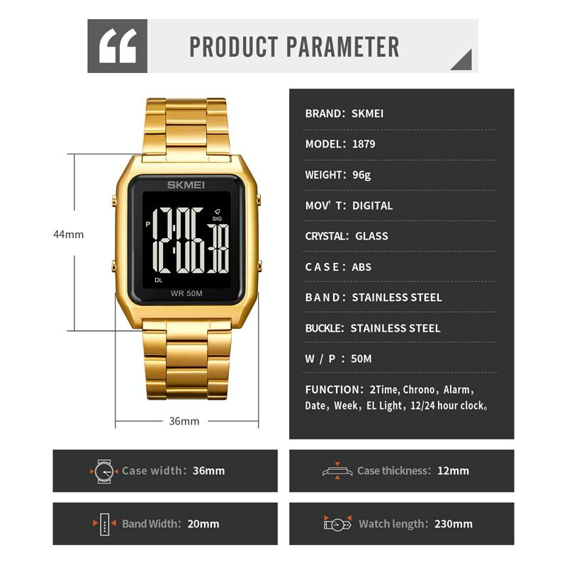 This large screen men’s multi-function luminous watch features a sleek square textured shell with a digital display, combining modern design with practical functionality. It is suitable for various activities including swimming, thanks to its water resistance, and offers multiple features for everyday use and sports.