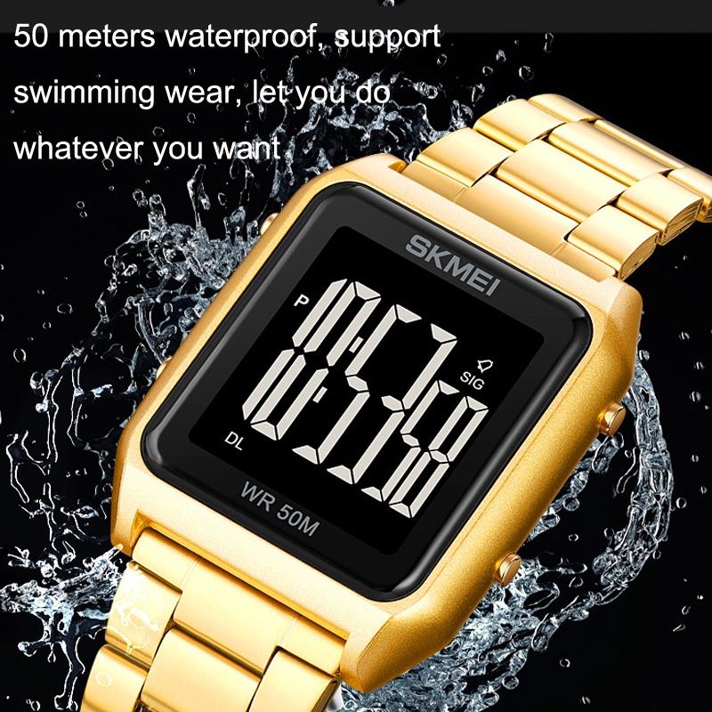 This large screen men’s multi-function watch features a sleek steel belt and luminous display, combining stylish design with practical functionality. It is suitable for various activities including swimming, thanks to its water resistance and durable construction.