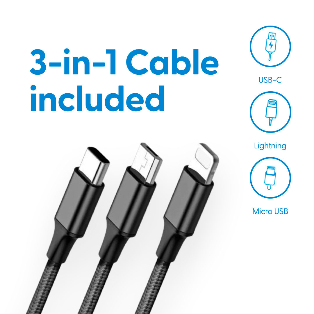 • Includes a 3-in-1 charging cable compatible with USB-C, Micro-USB, and Lightning devices