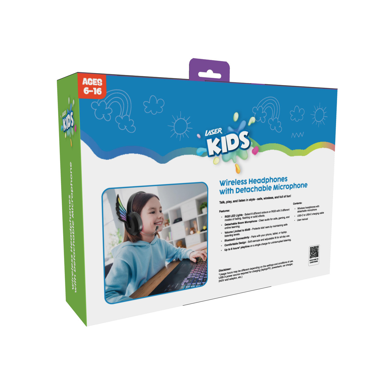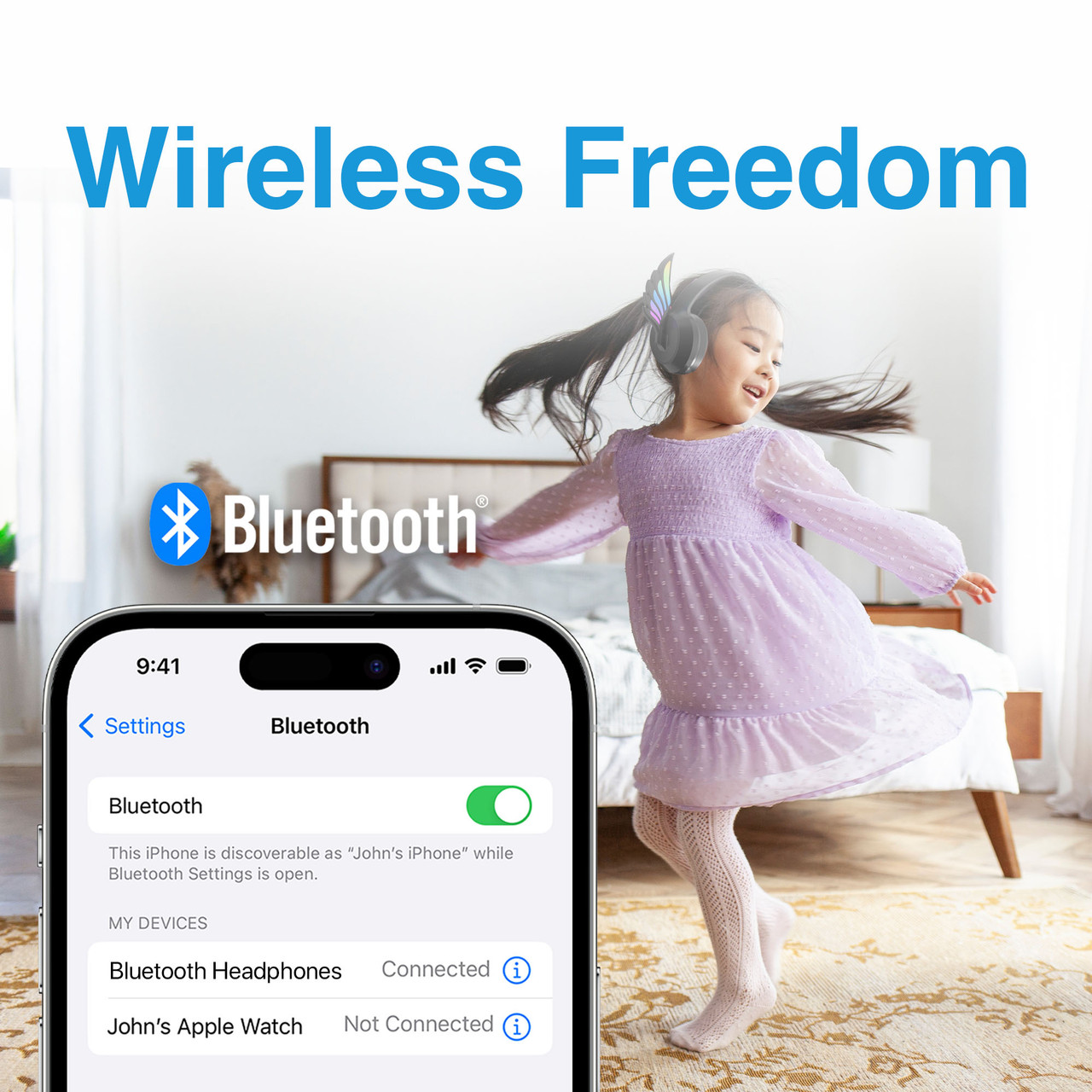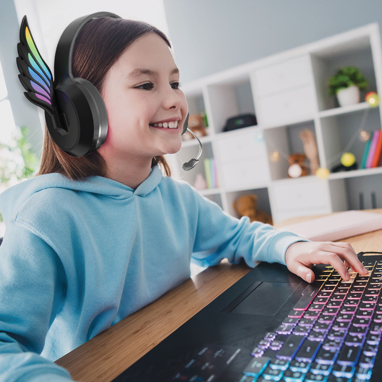 These wireless headphones are designed for children, combining fun, safety, and style. They feature vibrant LED lights, a detachable microphone, and a comfortable adjustable fit, making them suitable for music, gaming, and online learning. The headphones provide high-quality sound with a safe volume limit to protect young ears, along with long-lasting battery life for extended use.