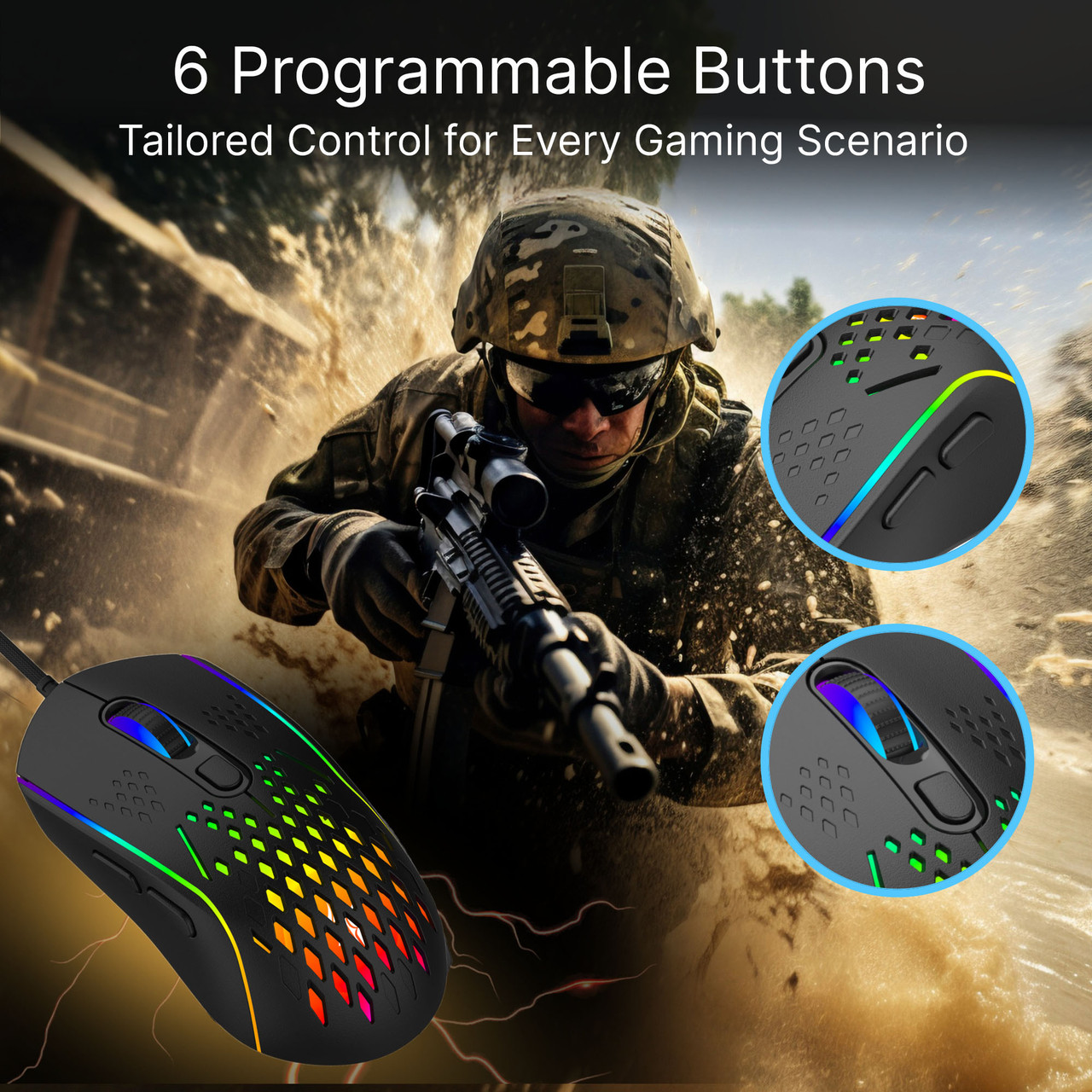 This lightweight gaming mouse is designed to enhance your performance with high responsiveness, ease of use, and comfort. It features an advanced optical sensor for precise tracking and an ergonomic, ultra-lightweight body to support quick movements and reduce fatigue during extended gaming sessions.