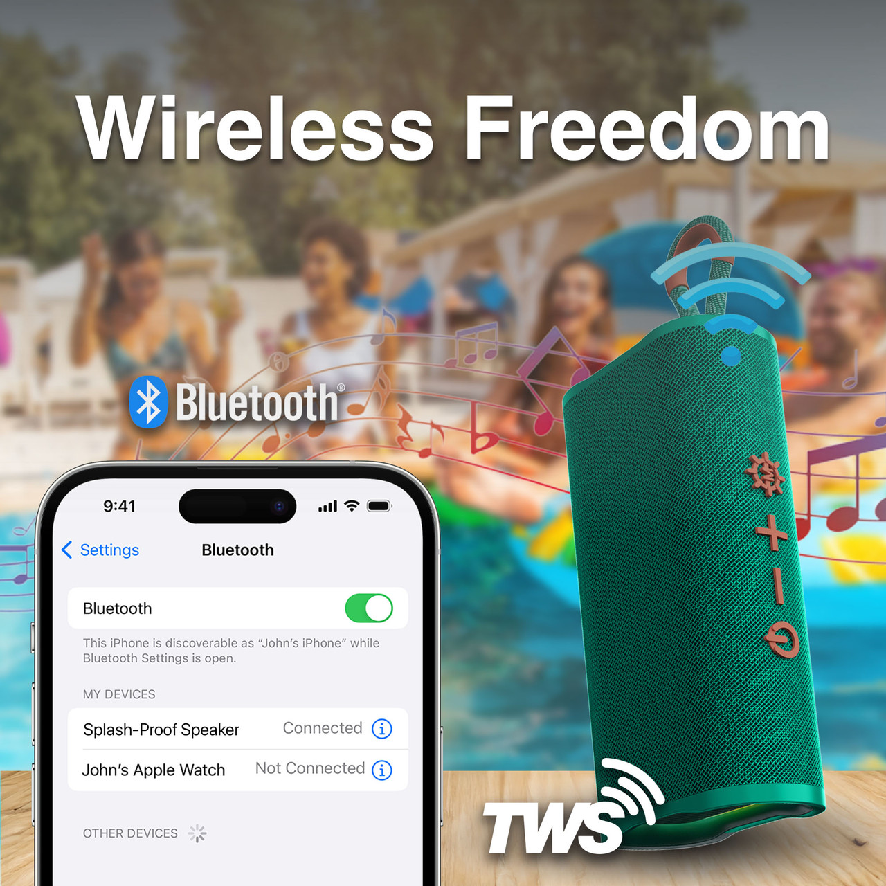 - Bluetooth connectivity with True Wireless Stereo (TWS) pairing to stream wirelessly or connect two speakers for stereo sound