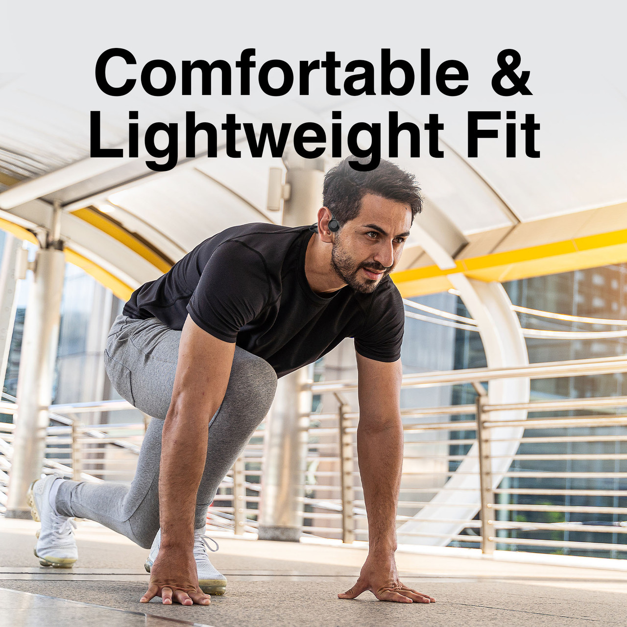 - Open-ear air conduction design allows users to stay alert to their surroundings while listening to audio.