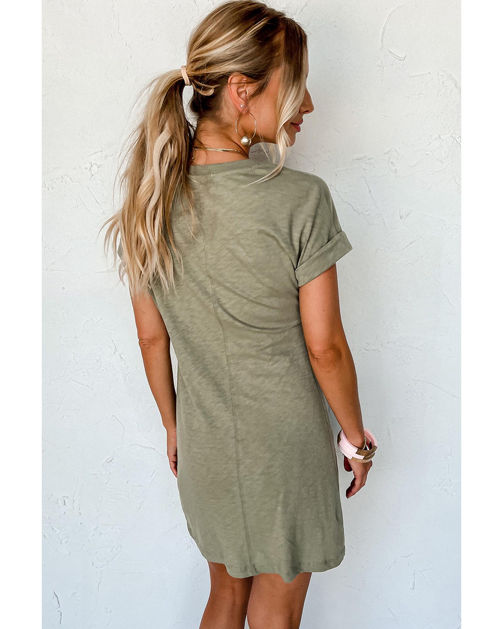 This mini T-shirt dress features a trendy twisted design with folded sleeves and a classic round neckline. It offers a comfortable fit with a stylish look suitable for various occasions. The dress is designed to complement most body types and is available in multiple sizes to ensure the perfect fit.