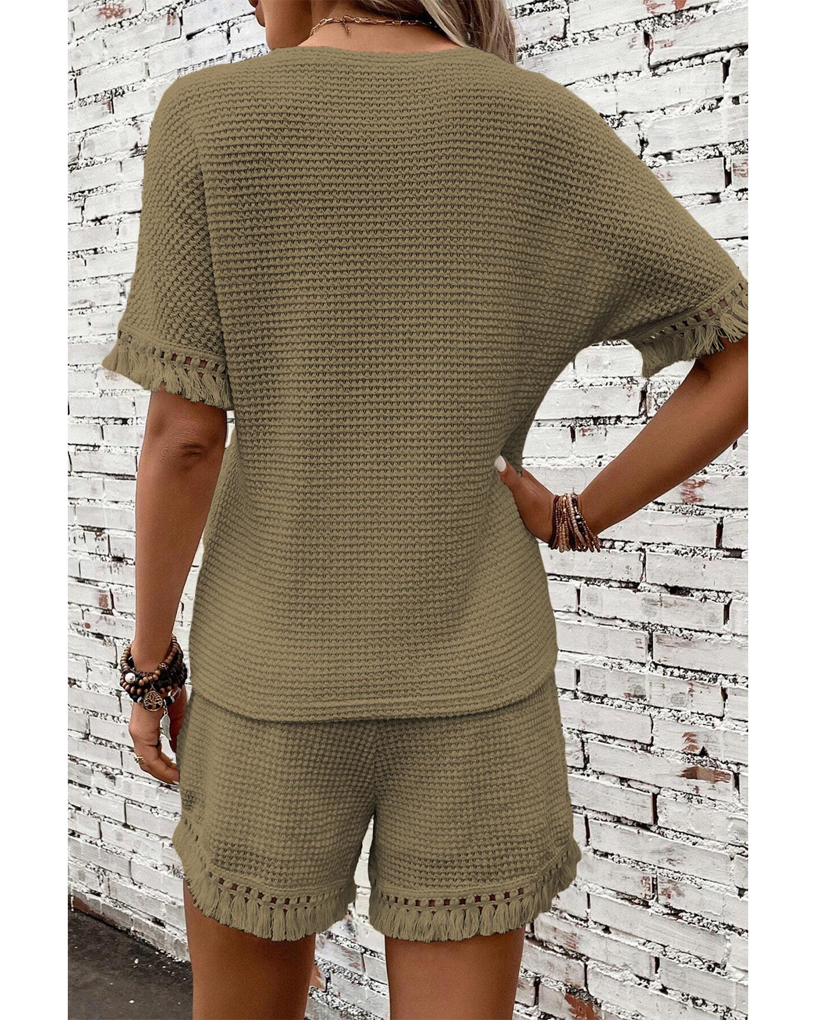 This Laurel Green Fringe Trim Textured Short Two Piece Set offers a trendy and comfortable style with a chic boho vibe. Designed with a textured fabric and fringe trim, it is perfect for casual and daily wear, combining fashion and comfort effortlessly.