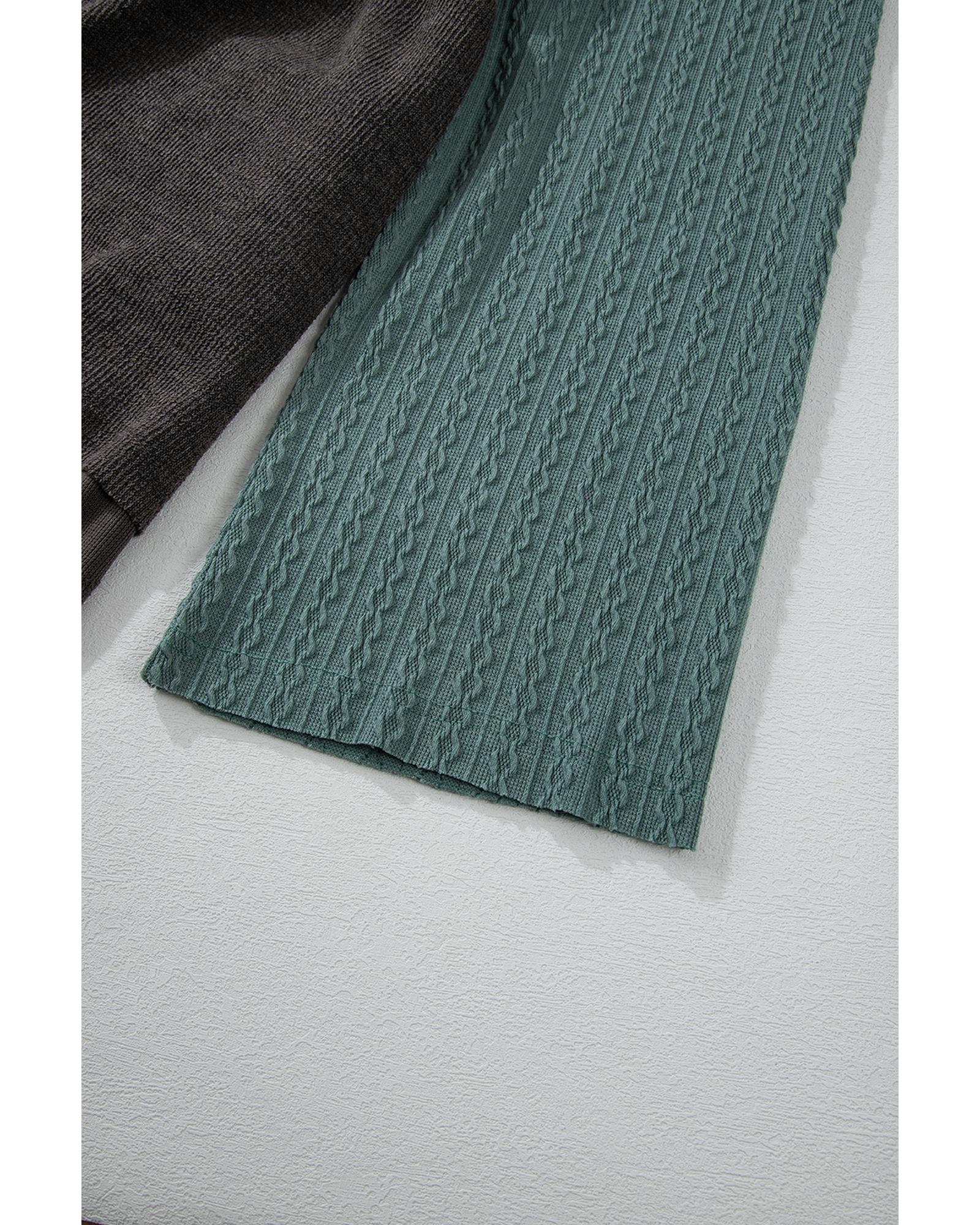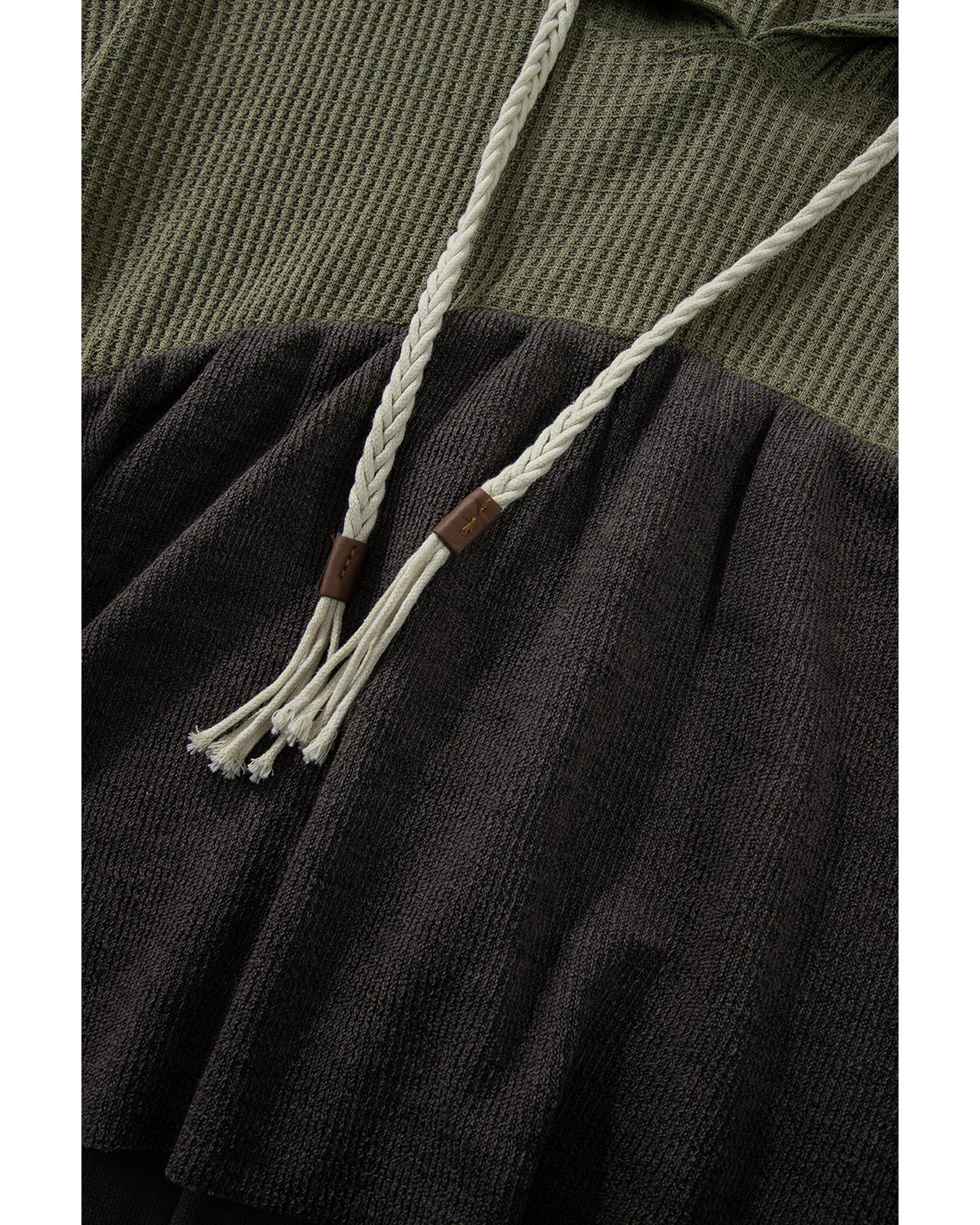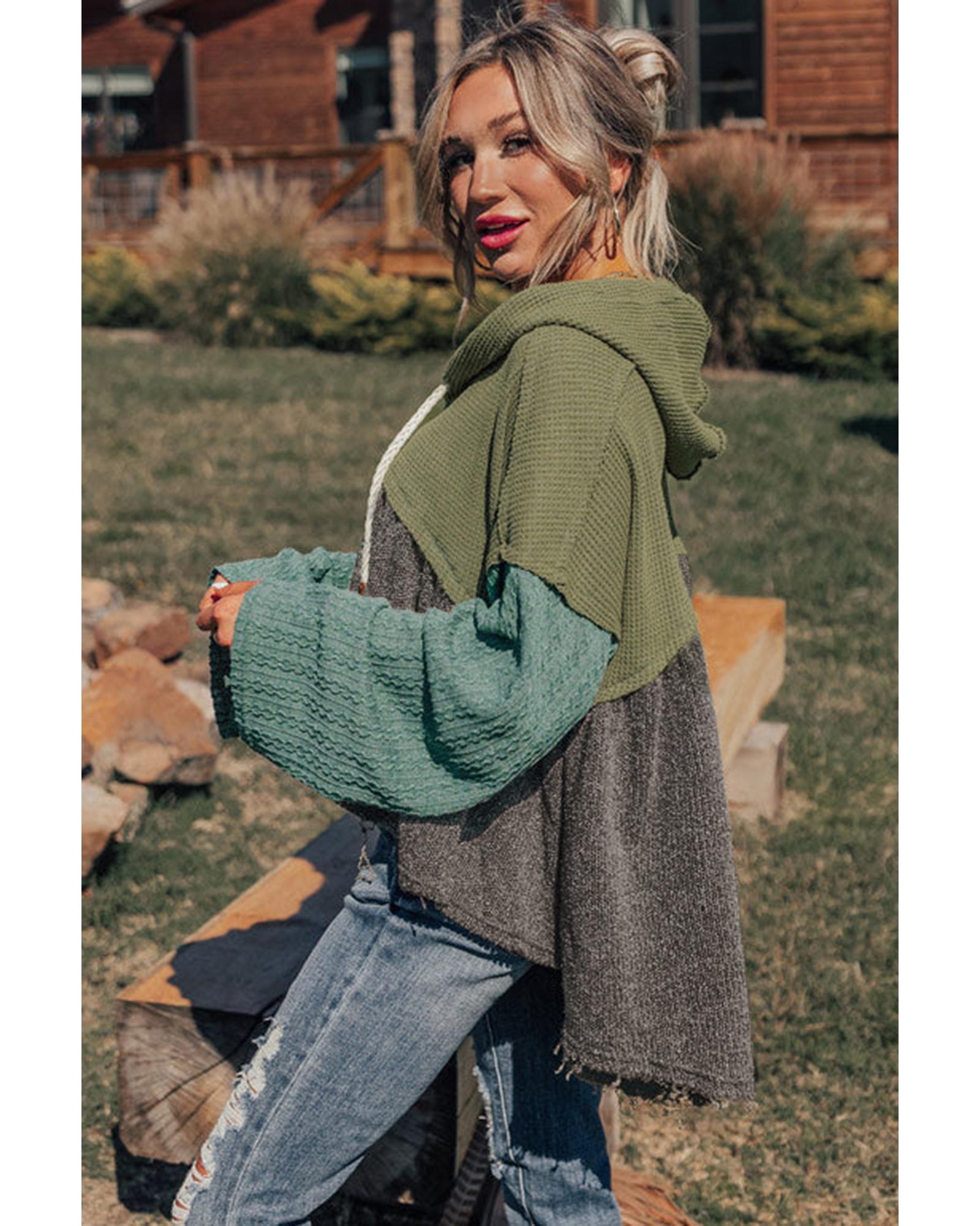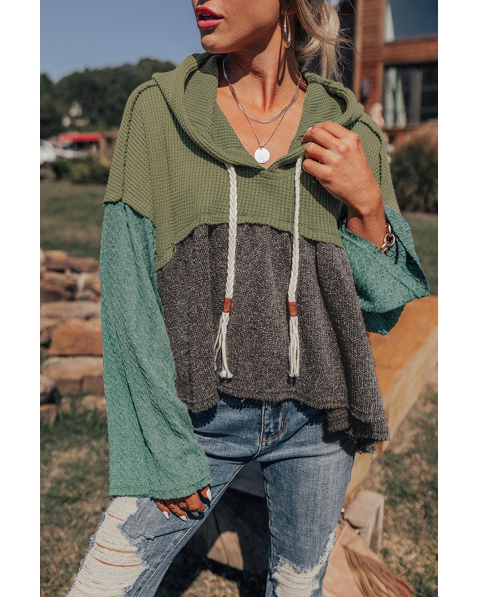 Laurel Green Mixed Textured Colorblock Patchwork Wide Sleeve Frayed High Low Hooded Top – S