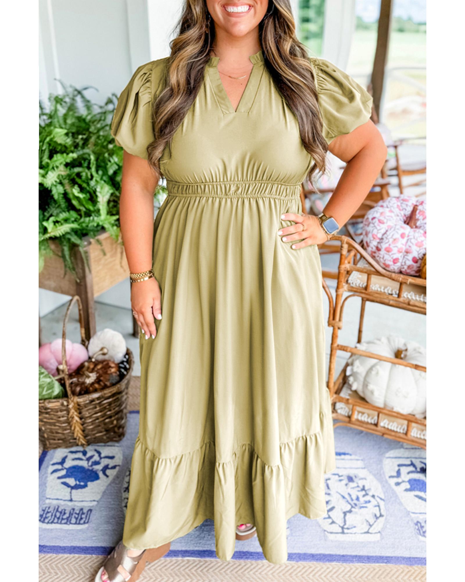 This plus size maxi dress features a stylish notched V-neck design and puff sleeves that add a touch of romance. The tiered skirt creates a flowy and feminine silhouette, making it perfect for various occasions. Designed specifically for plus size figures, it offers a comfortable and flattering fit.