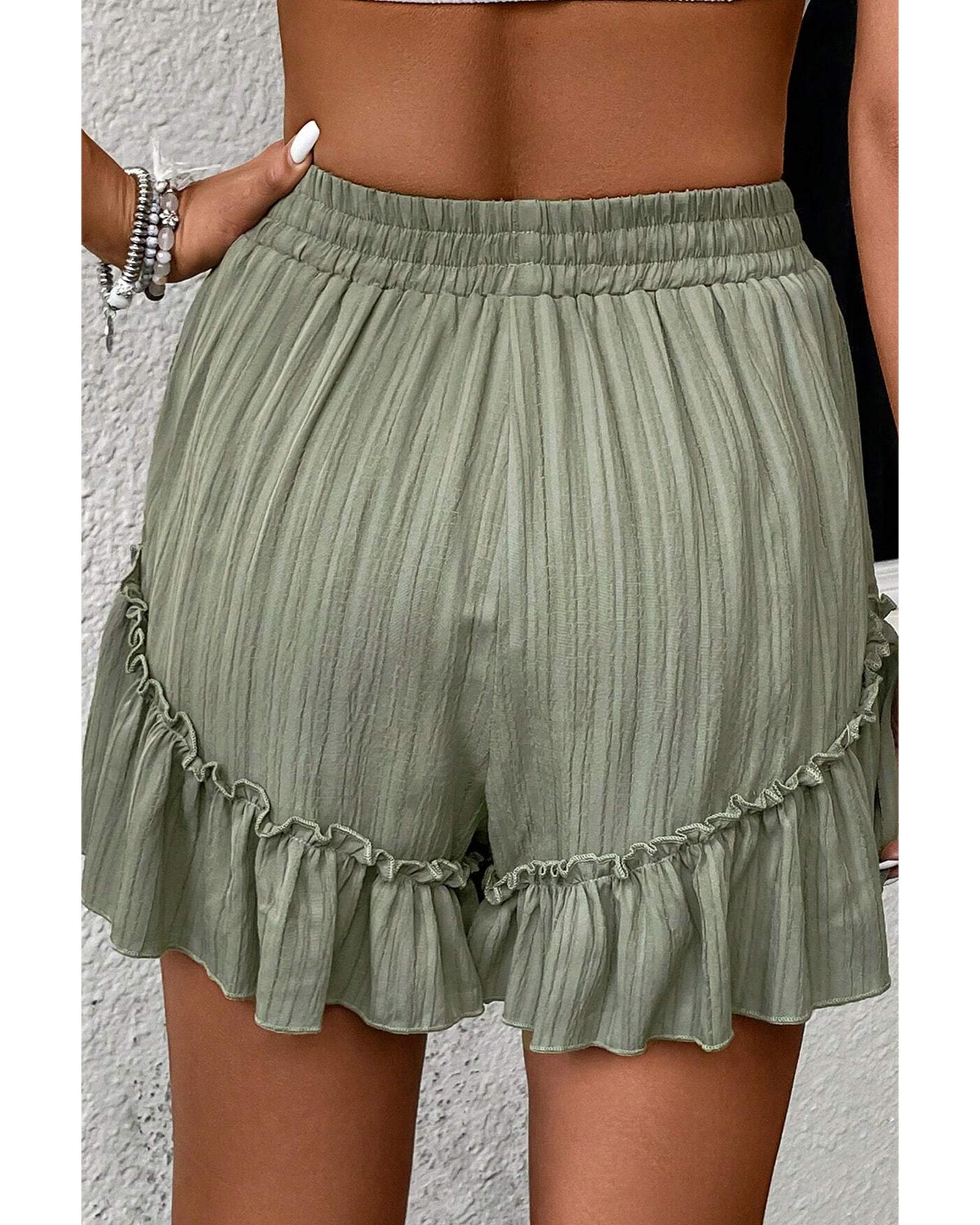 These Laurel Green Textured Tie Waist Ruffle Hem Shorts combine stylish design with comfortable wear. Made from textured fabric, they are suitable for both casual and dressy occasions, offering a versatile addition to your wardrobe.