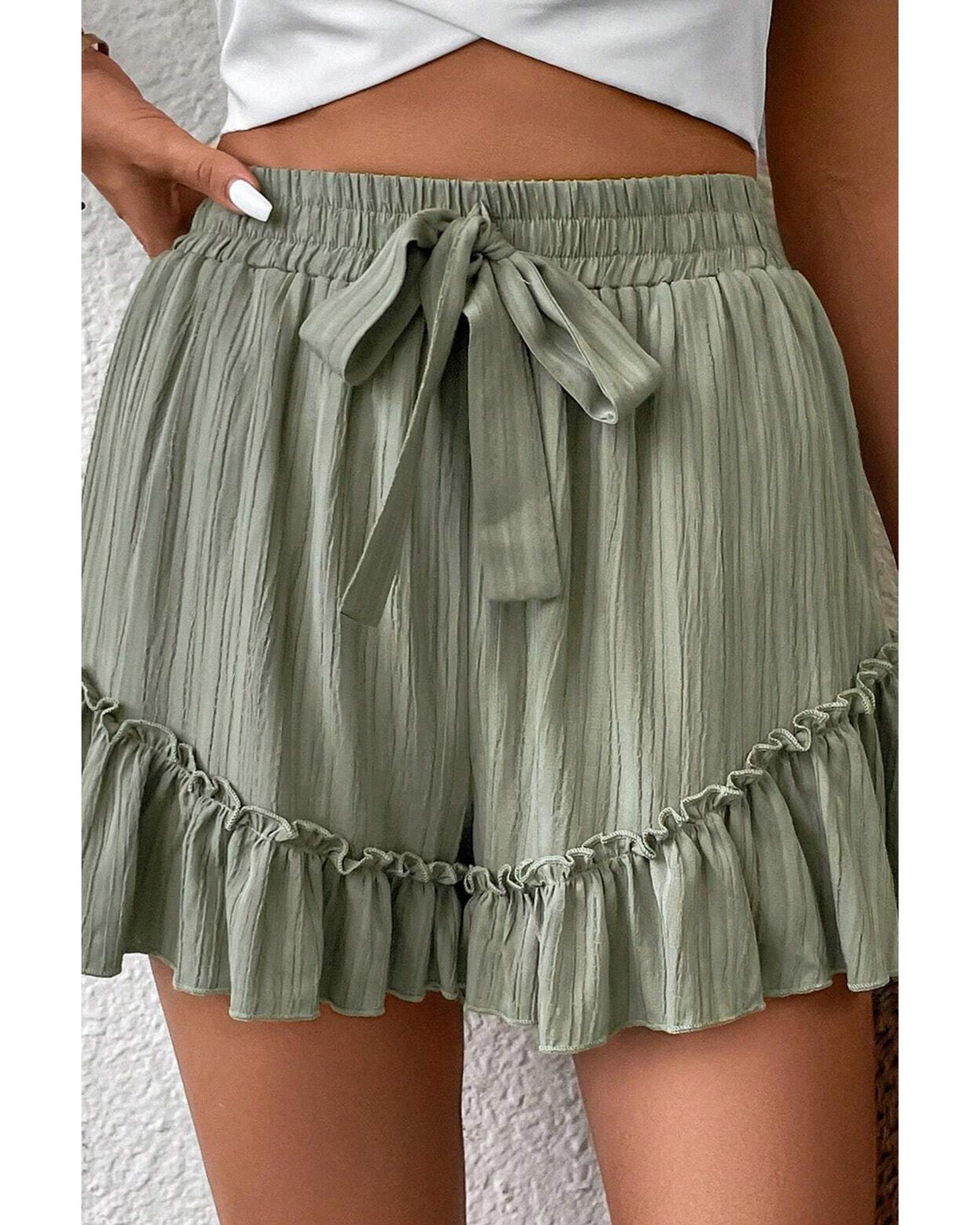 These Laurel Green Textured Tie Waist Ruffle Hem Shorts combine stylish design with comfortable wear. Made from textured fabric, they are suitable for both casual and dressy occasions, offering a versatile addition to your wardrobe.
