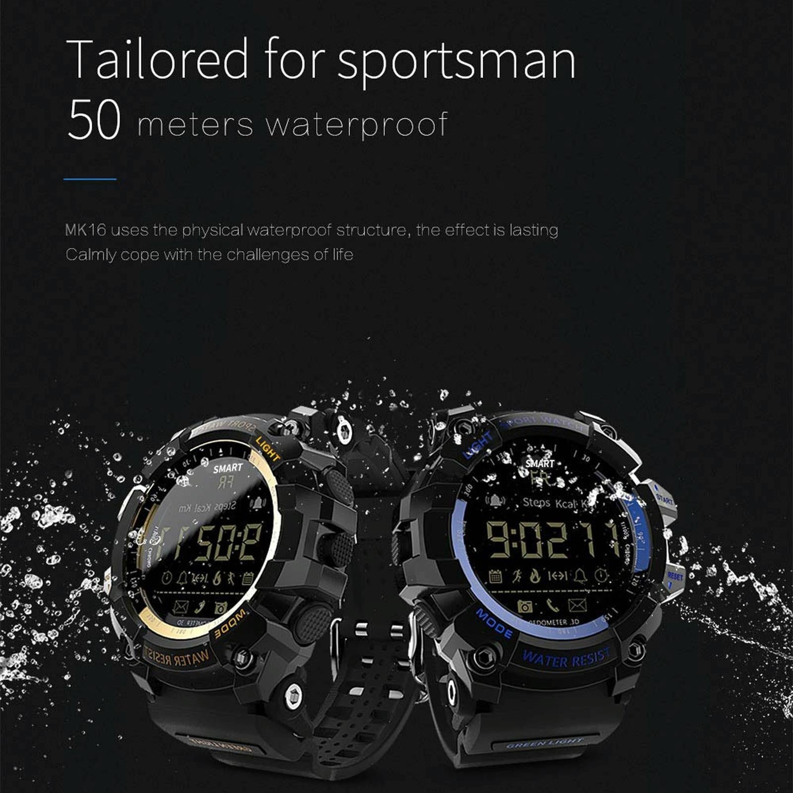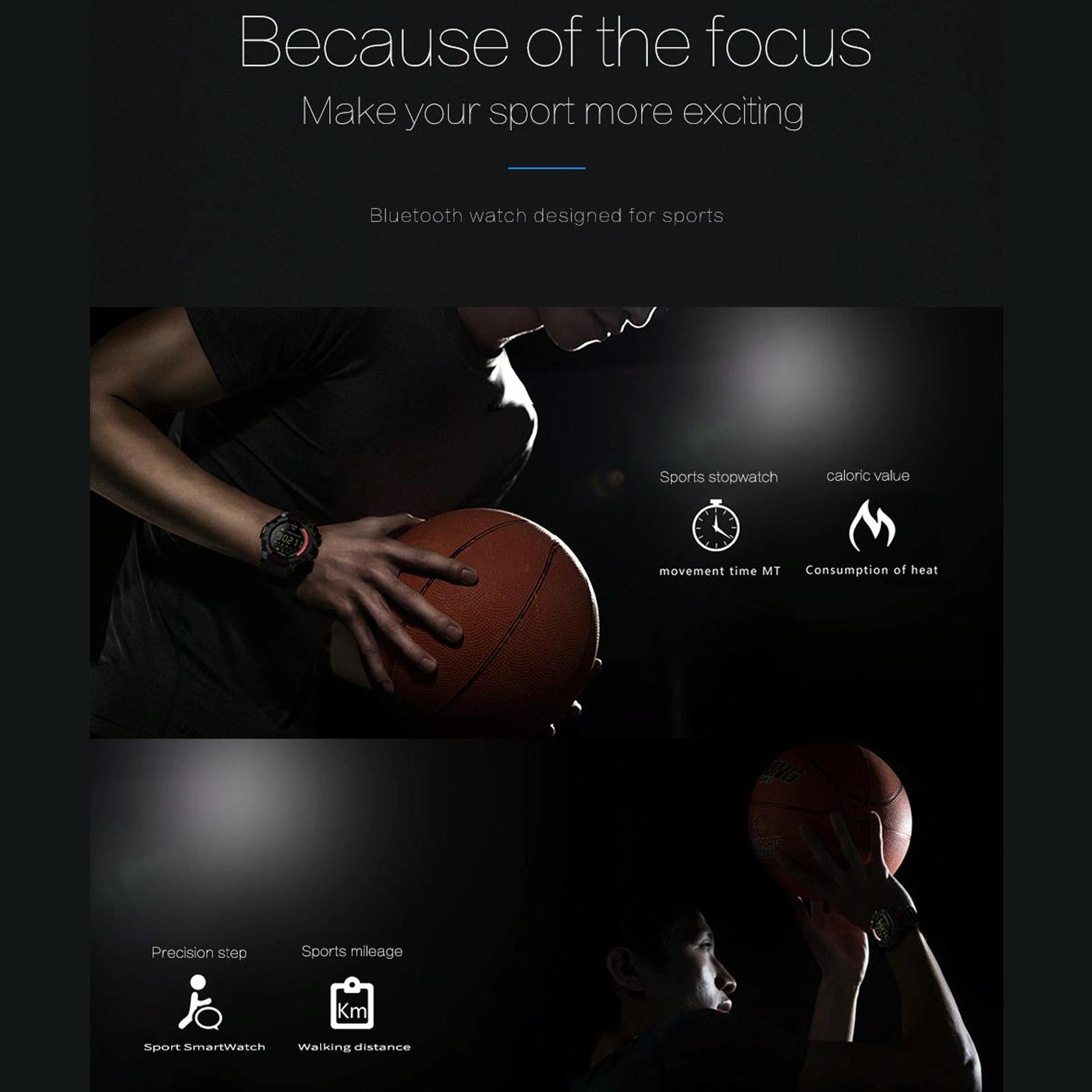 This waterproof smart watch features a 50-meter water resistance level and a clear LCD screen with full viewing angle. It supports multiple functions including activity tracking, notifications, and remote camera control, making it suitable for everyday use and outdoor activities.