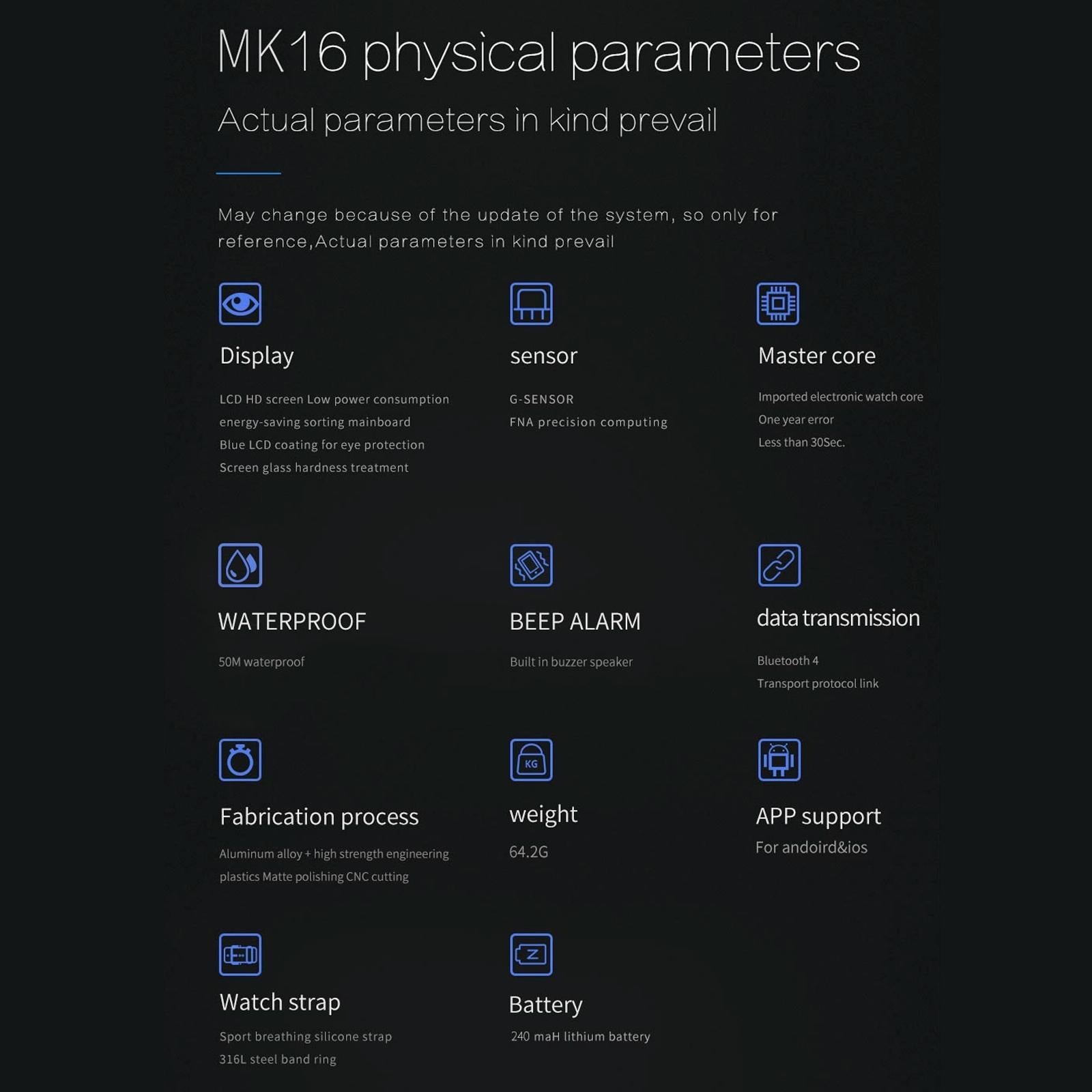 - Exercise recording functions including pedometer, calorie burn, and mileage with 15-day data storage