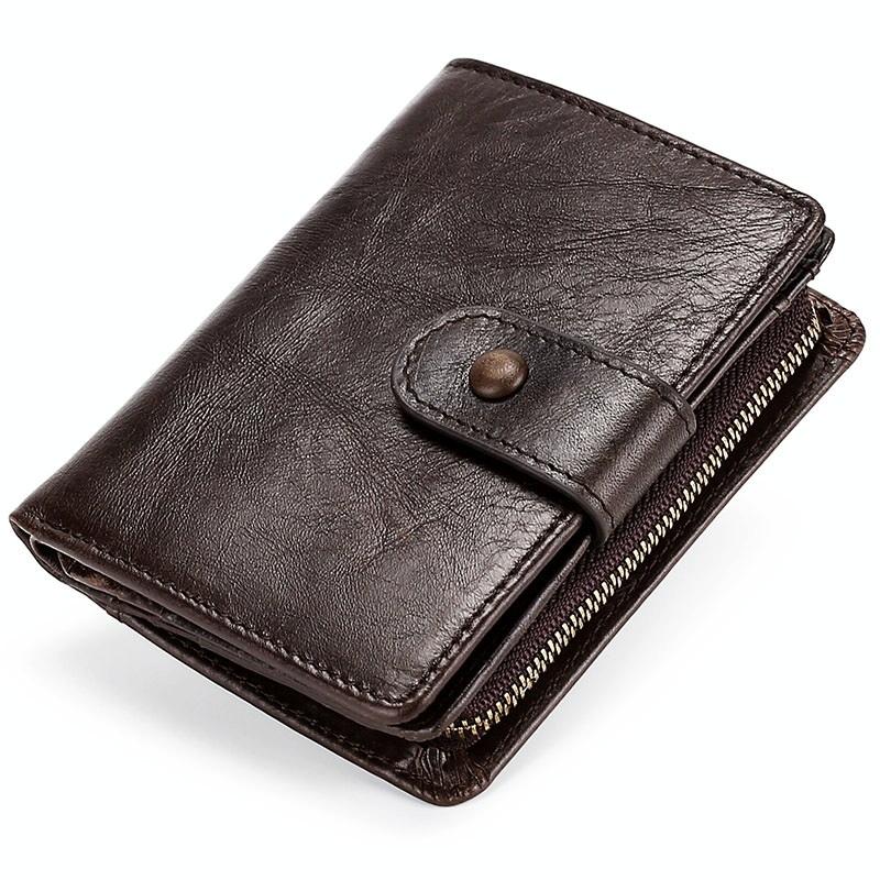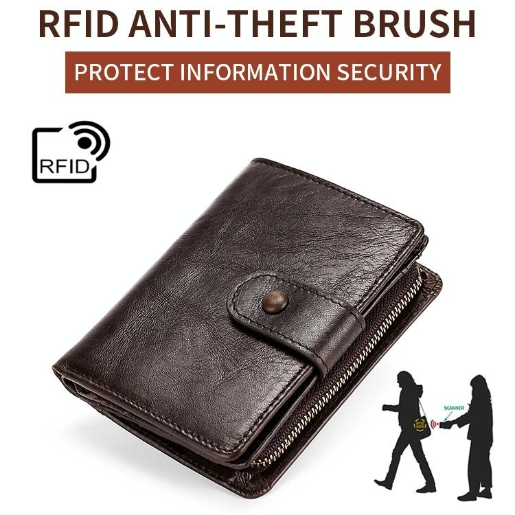 This leather RFID wallet combines style and functionality, crafted from shiny and comfortable cowhide material. It features multiple card slots for organized storage and is designed to be easy to carry. The wallet also includes an RFID anti-theft brush function to protect your personal information.