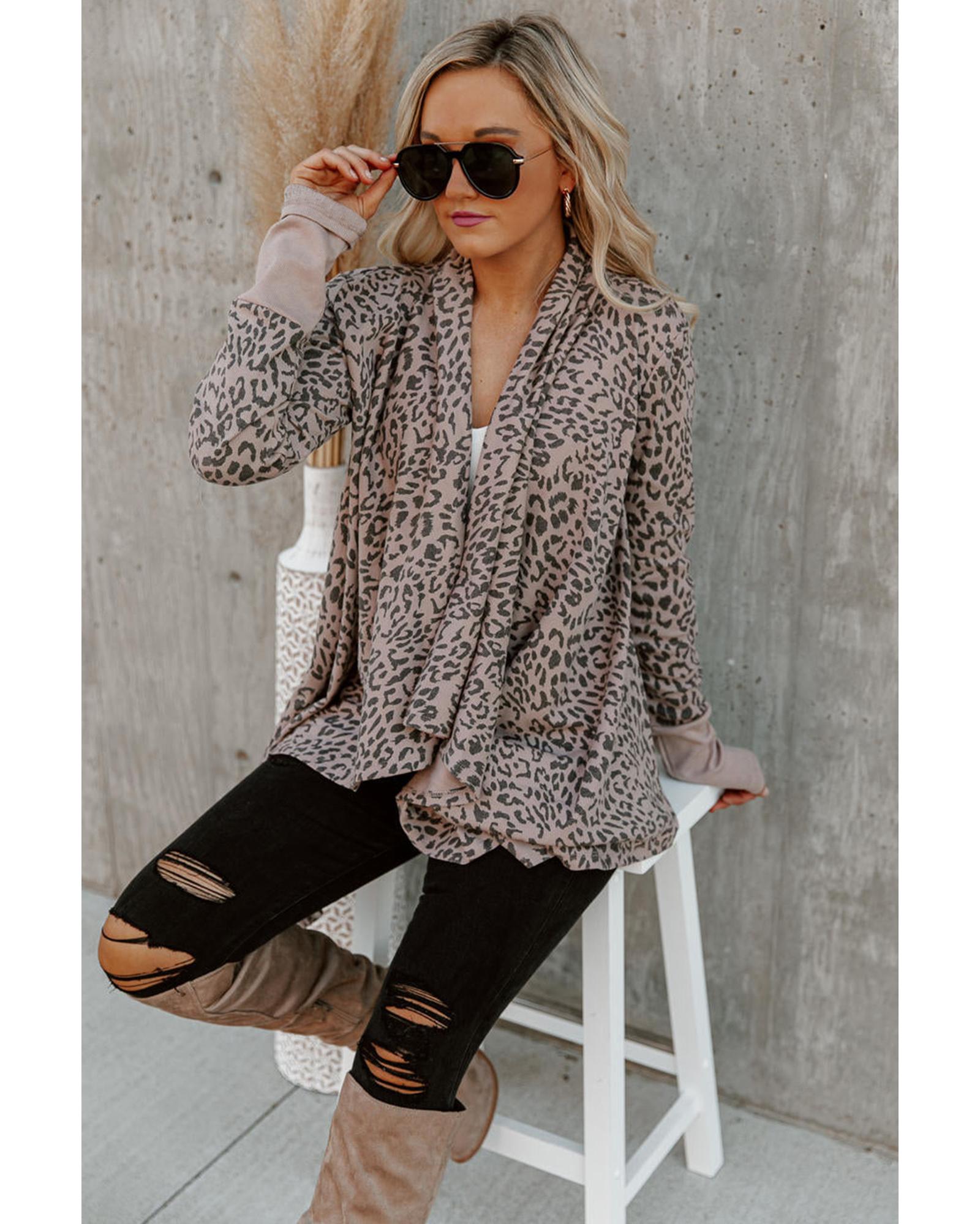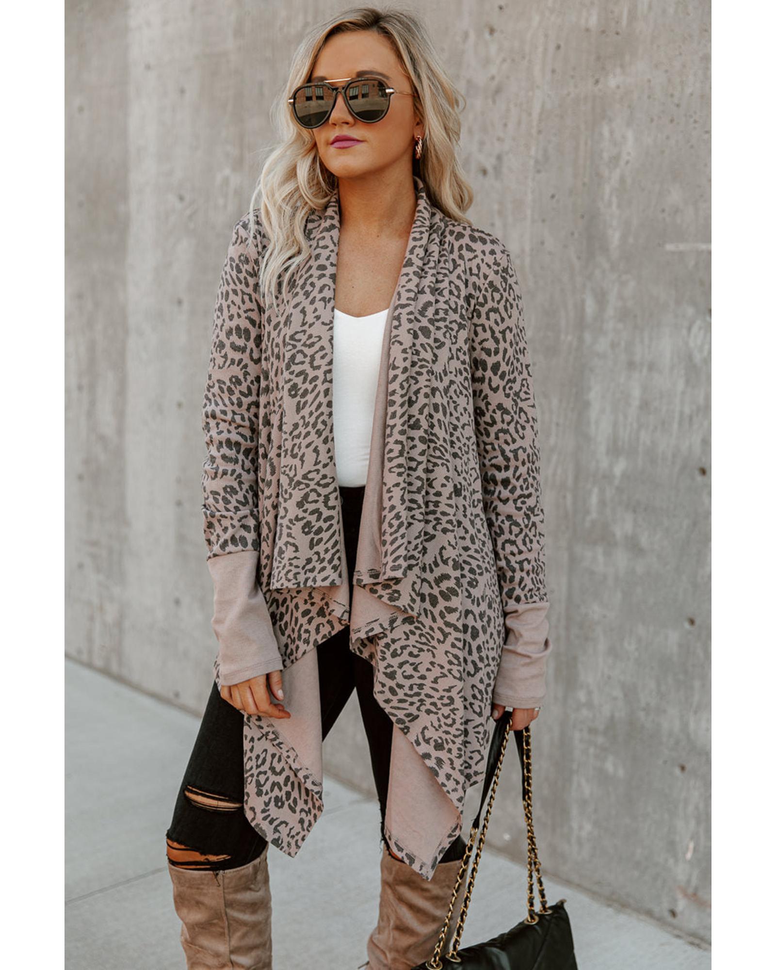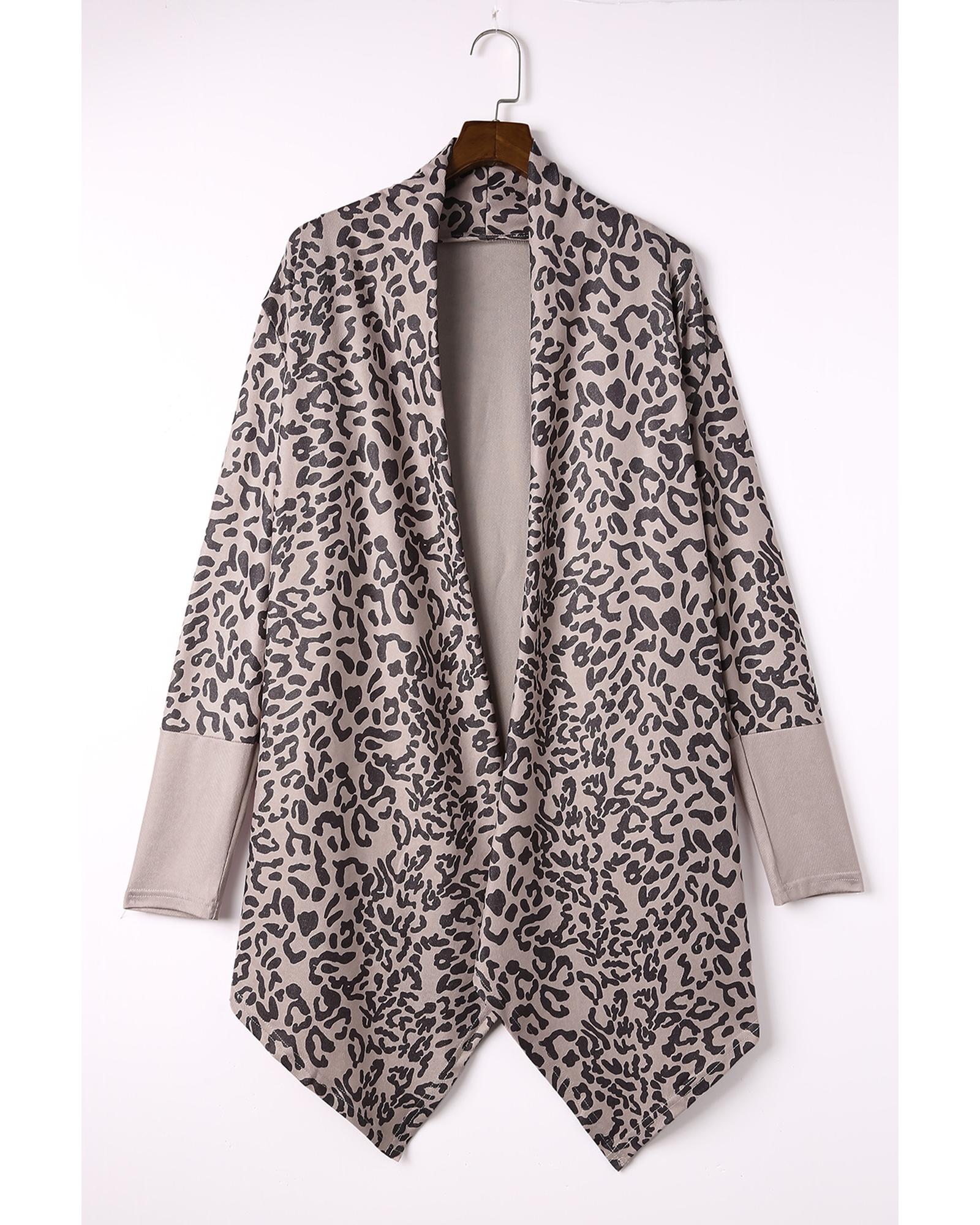 This open front cardigan features a bold leopard print and a draped design, offering a trendy and versatile look. Its stylish pattern and relaxed fit make it suitable for pairing with denim and knee-high boots, perfect for casual or chic outfits.