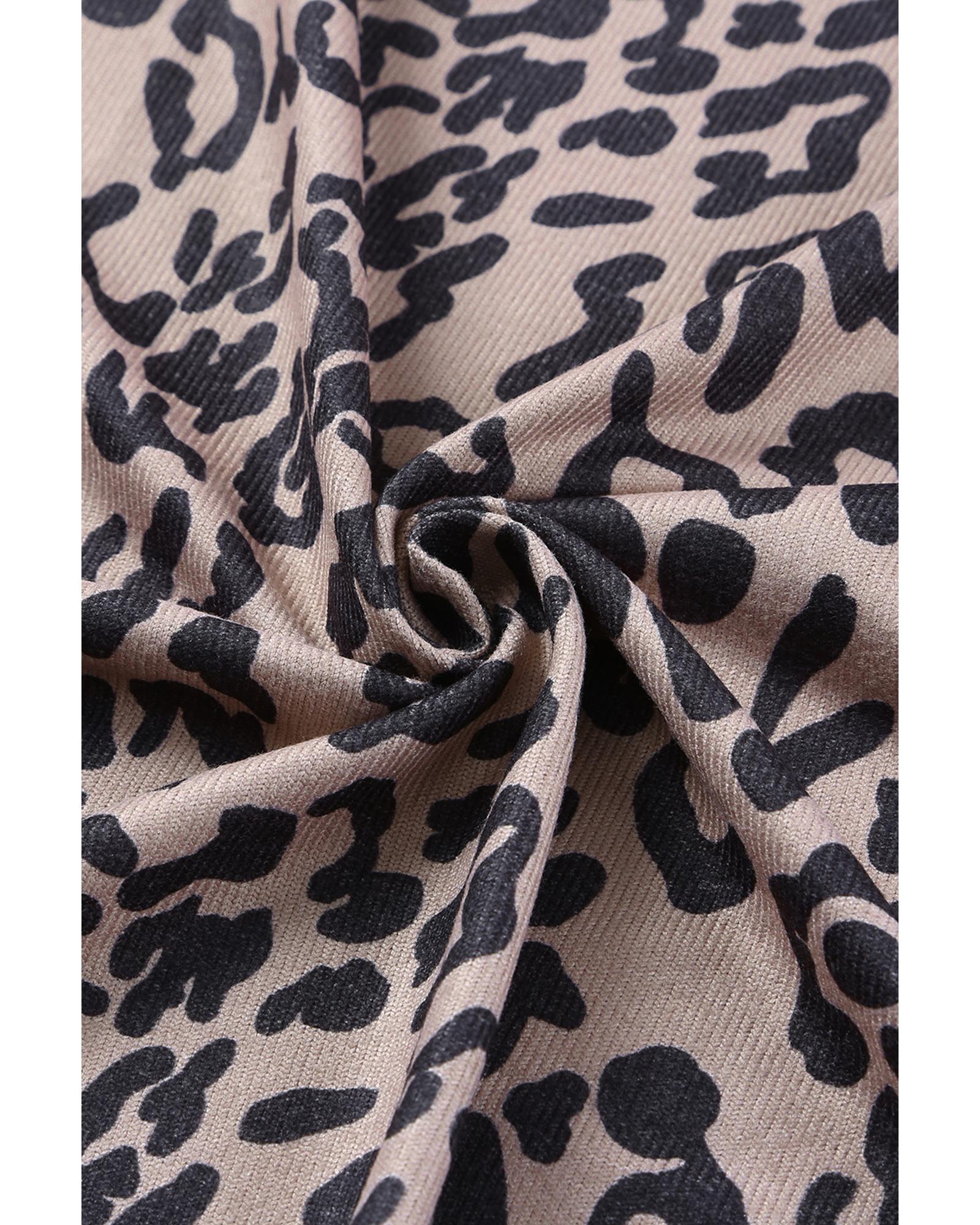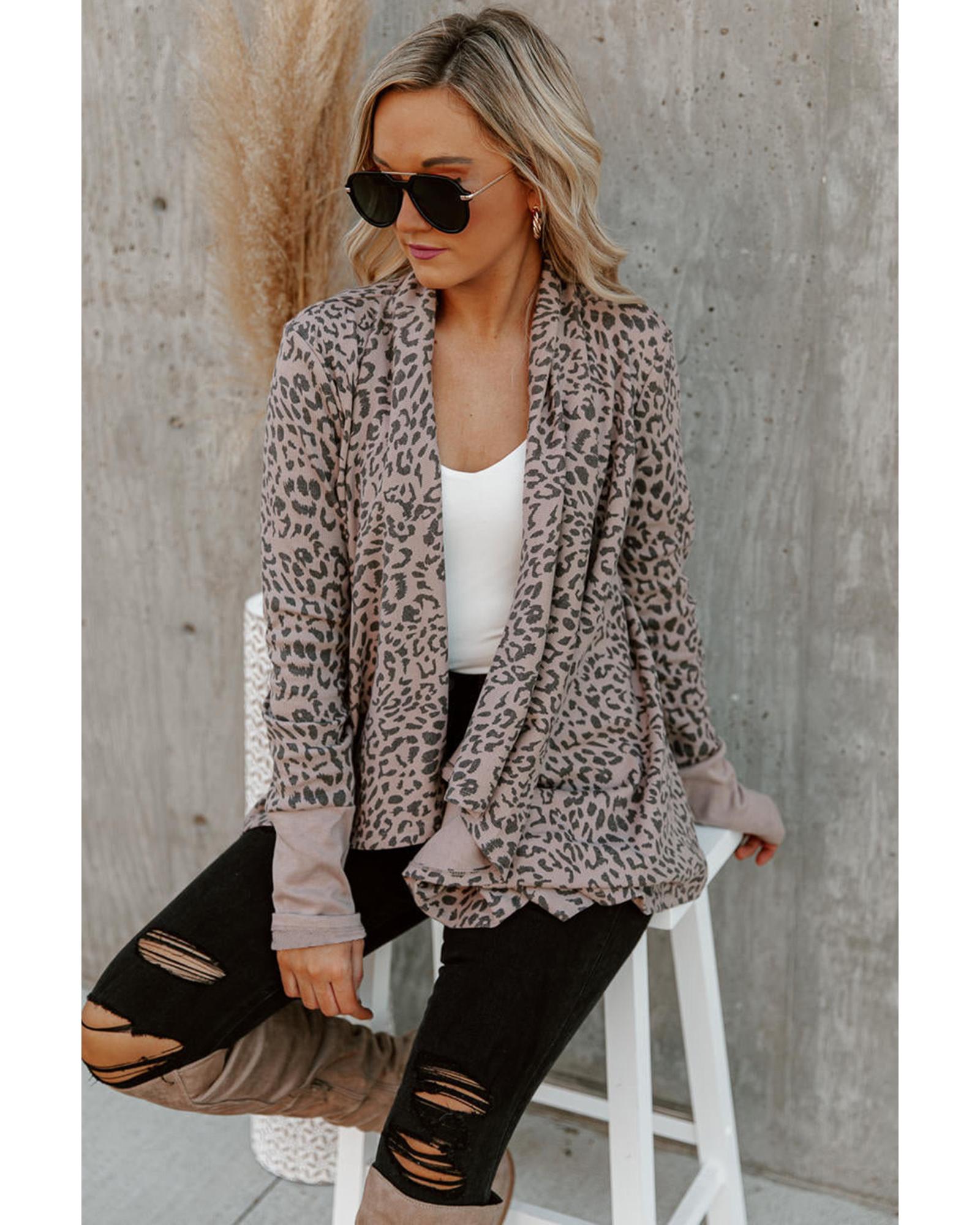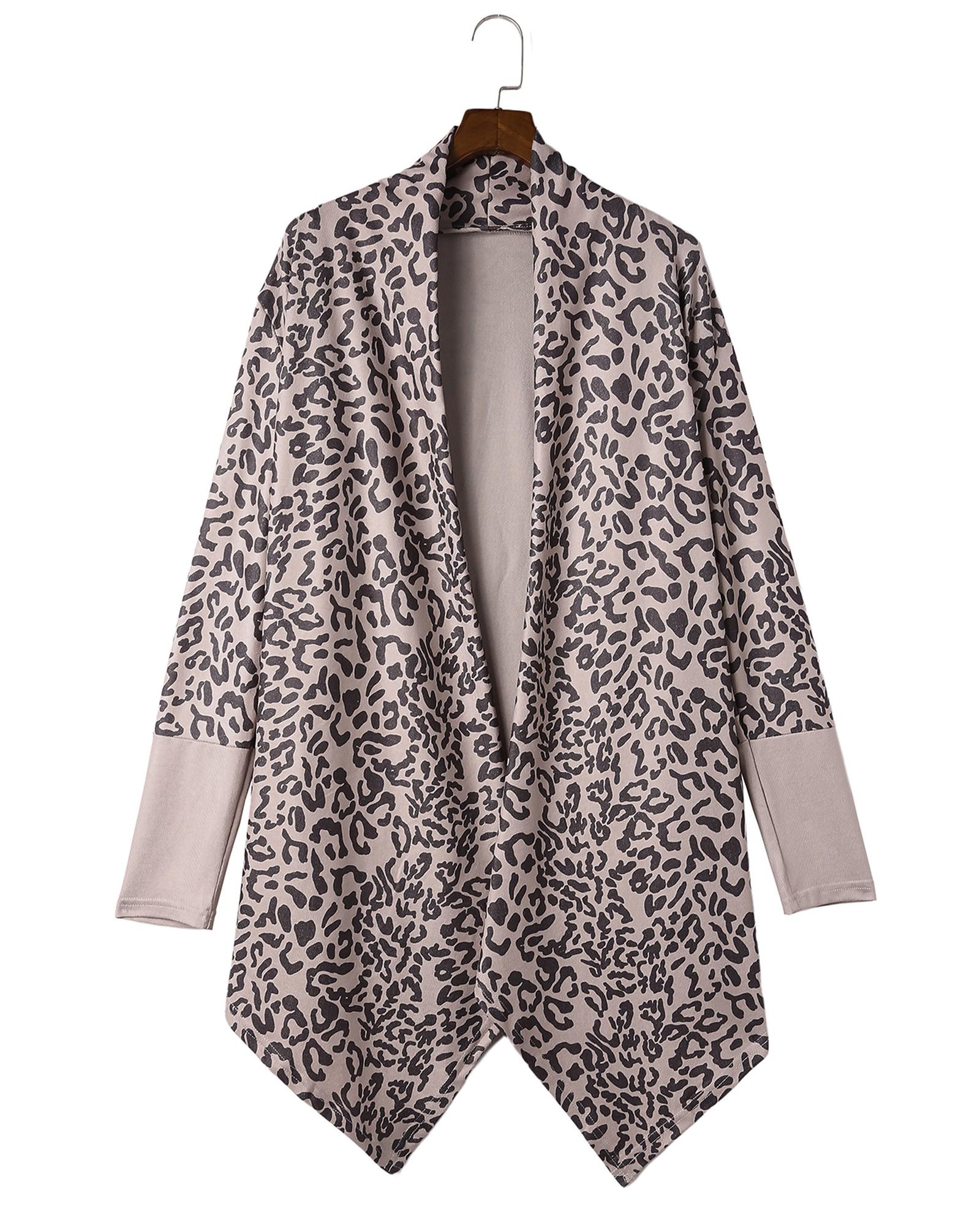 This open front cardigan features a bold leopard print and a draped design, offering a trendy and versatile look. Its stylish pattern and relaxed fit make it suitable for pairing with denim and knee-high boots, perfect for casual or chic outfits.