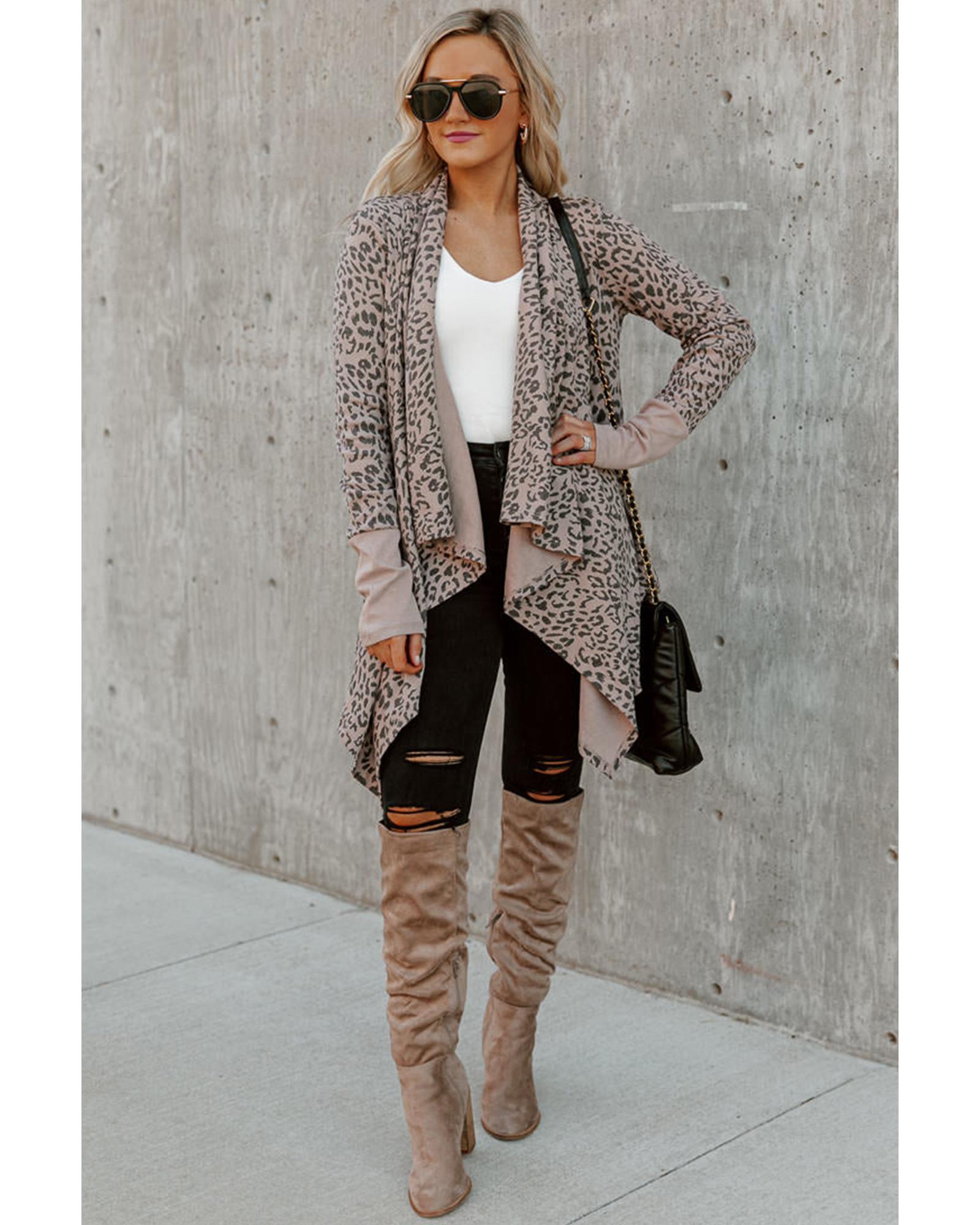 This open front cardigan features a bold leopard print and a draped design, offering a trendy and versatile look. Its stylish pattern and comfortable fit make it suitable for pairing with denim and knee-high boots, perfect for various casual occasions.