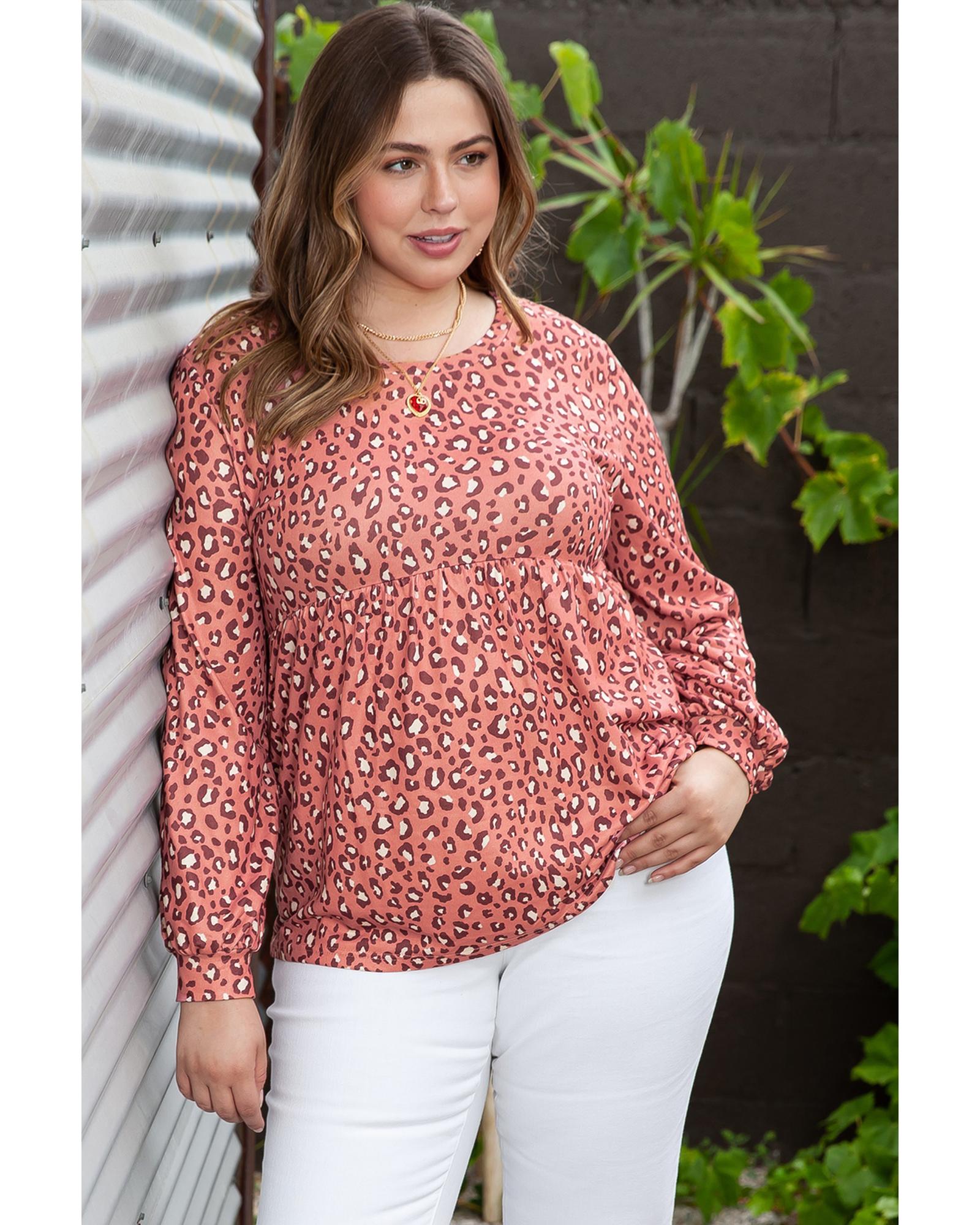 This stylish leopard print long sleeve blouse features a trendy babydoll design with ruffled details, making it a fashionable choice for plus size fashion. The long sleeves provide comfort for cooler weather, and the fitted style offers a modern silhouette.