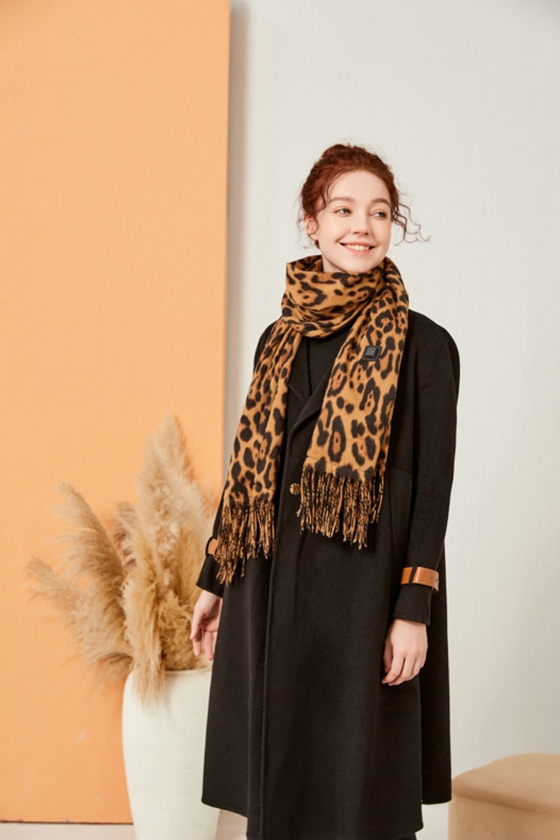 Stay warm and comfortable during the winter with this heated scarf featuring a stylish leopard print on a brown background. Designed for outdoor use, it provides quick and consistent heat to keep you cozy in cold weather. The scarf is easy to operate, washable, and powered via USB, making it a practical winter accessory for various outdoor activities and daily commuting.