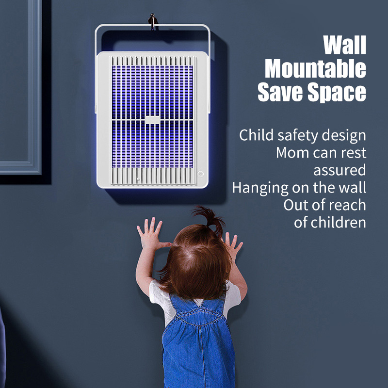 This insect killer lamp is designed to effectively eliminate mosquitoes, flies, and other pests both indoors and outdoors. It features a rechargeable battery, making it portable and convenient for various settings such as homes, outdoor areas, and camping trips.