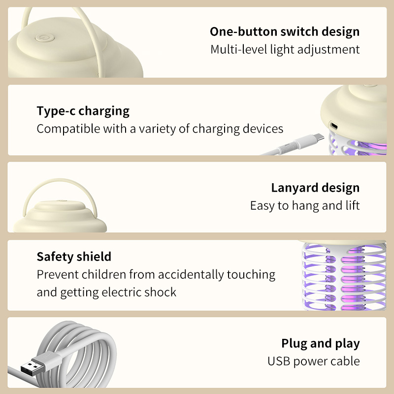 This mosquito killer lamp is designed for effective mosquito elimination both indoors and outdoors. It features a portable and versatile design suitable for home, camping, or outdoor activities. The device combines mosquito trapping with additional lighting functions, making it a practical solution for various environments.