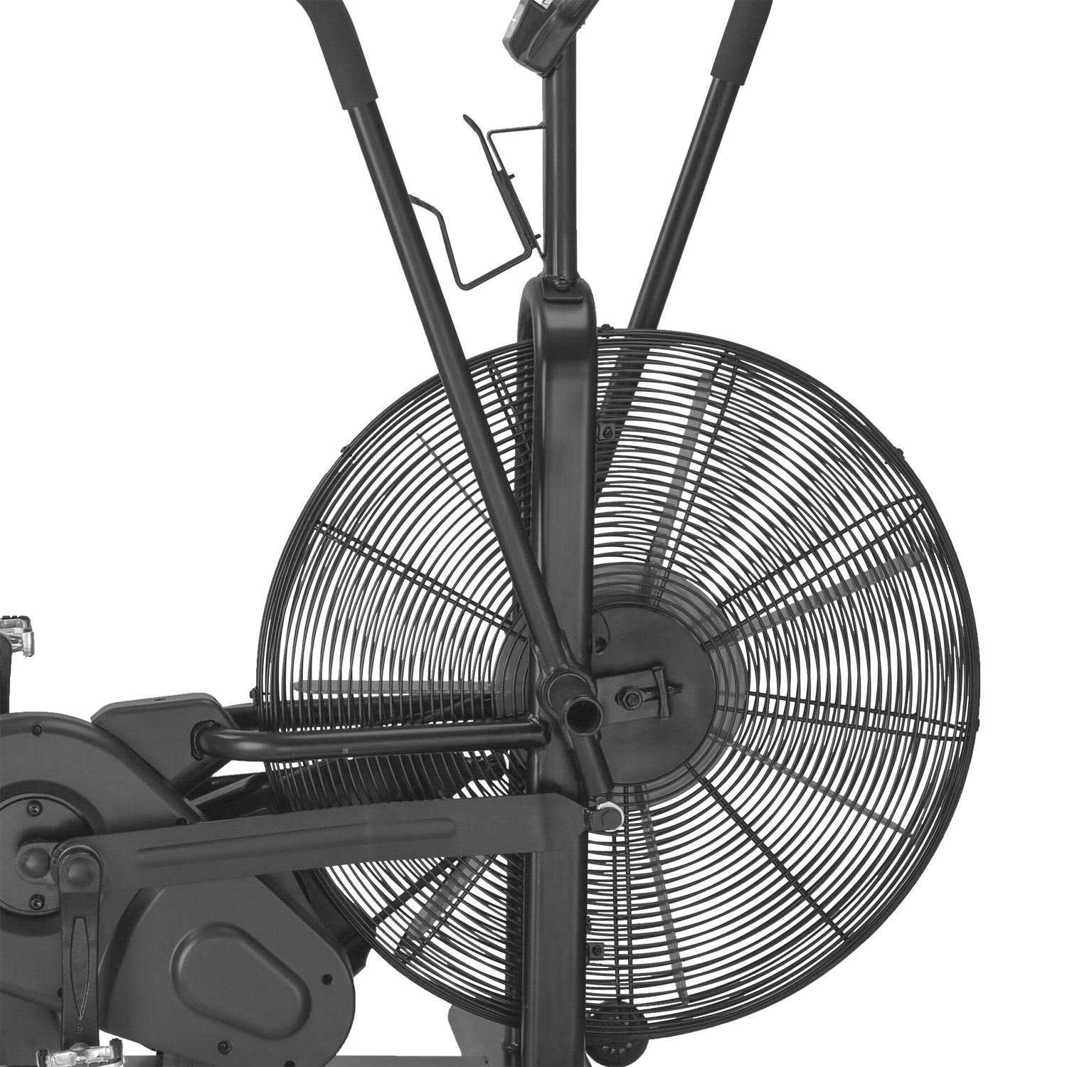 This commercial air bike is designed for durability and high performance, featuring dynamic air resistance and a large steel fan flywheel. It offers adjustable seating and pedal positions to accommodate users of various sizes, making it suitable for intense training sessions in fitness facilities.