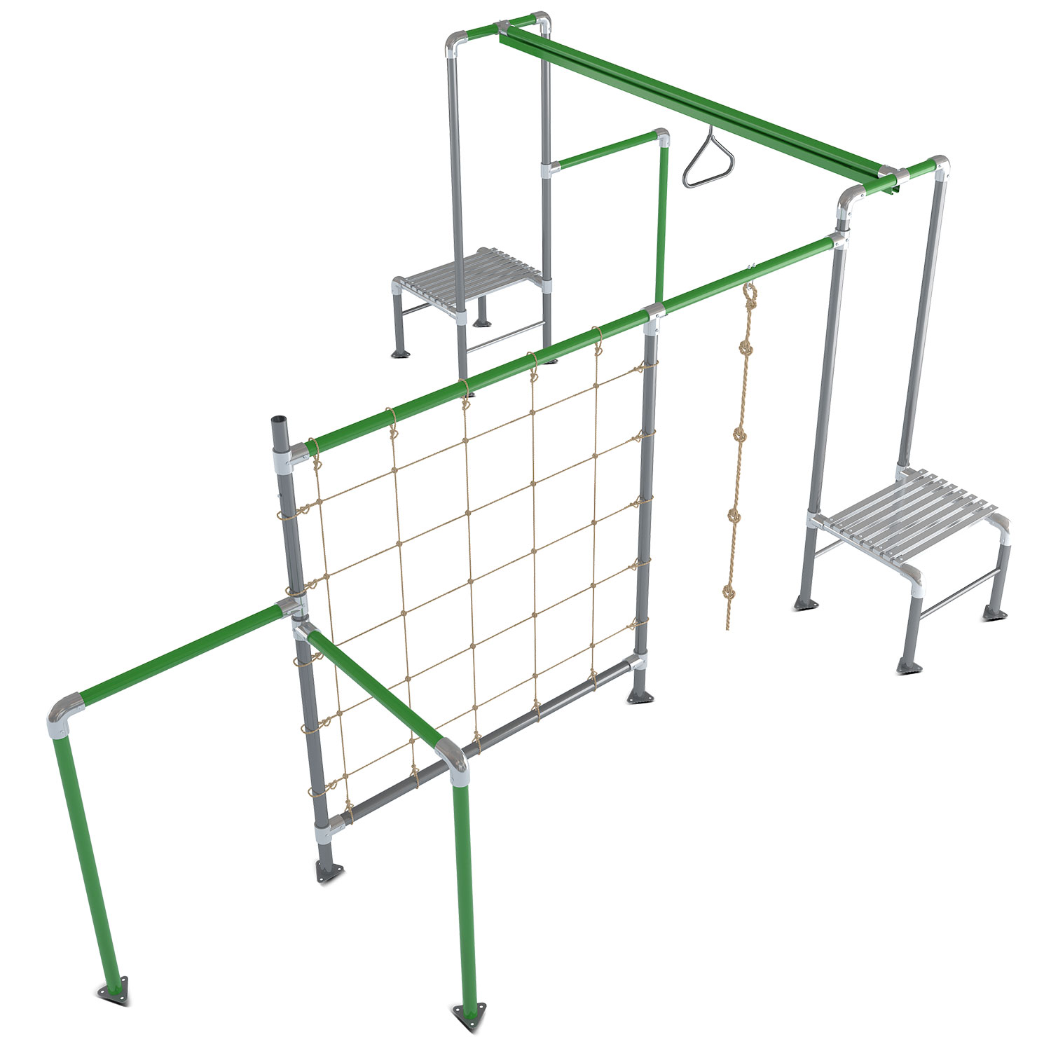 This backyard play equipment offers a variety of activities to keep children entertained for hours. It features a flying fox, climbing ropes, and obstacles to promote outdoor activity and physical development.