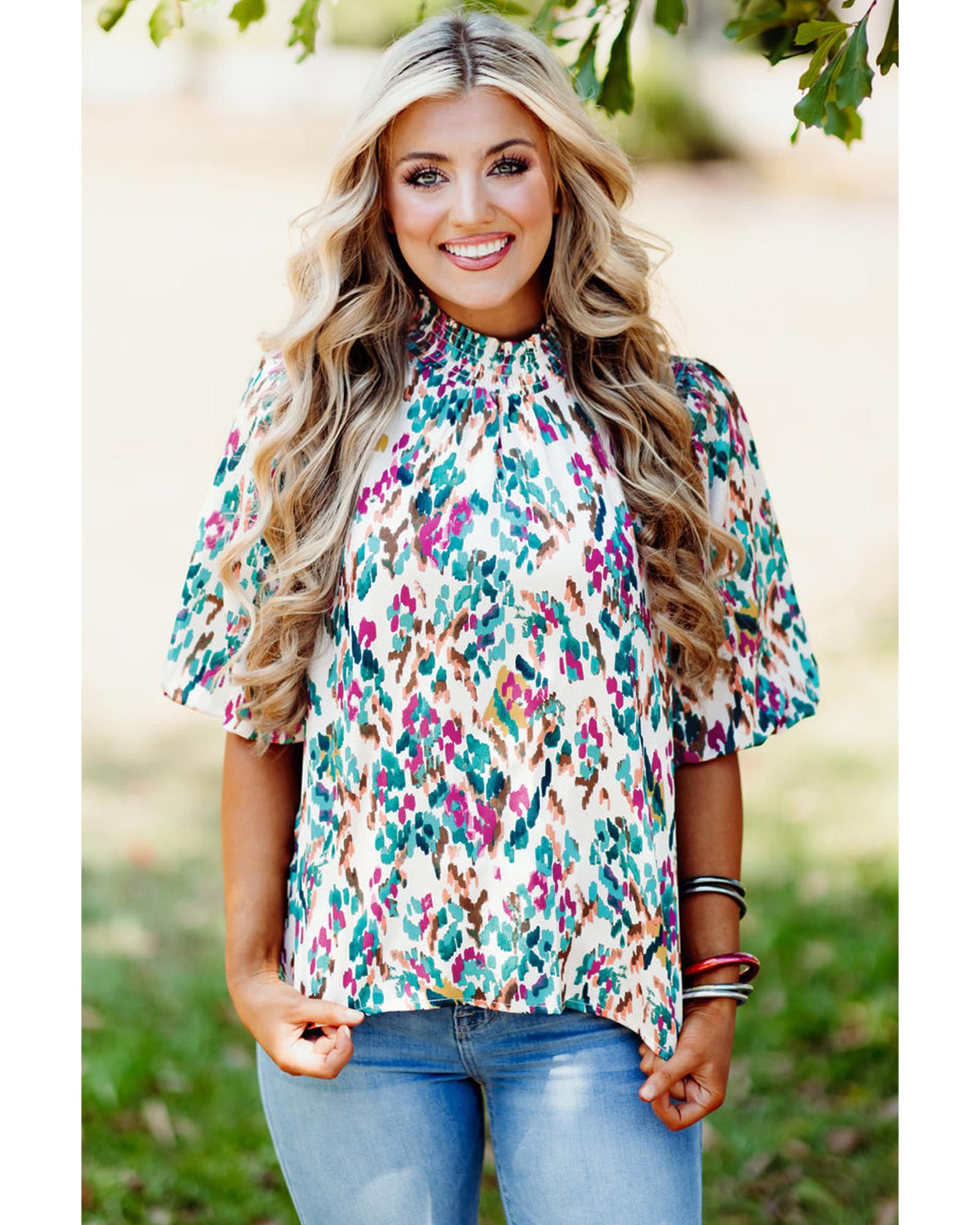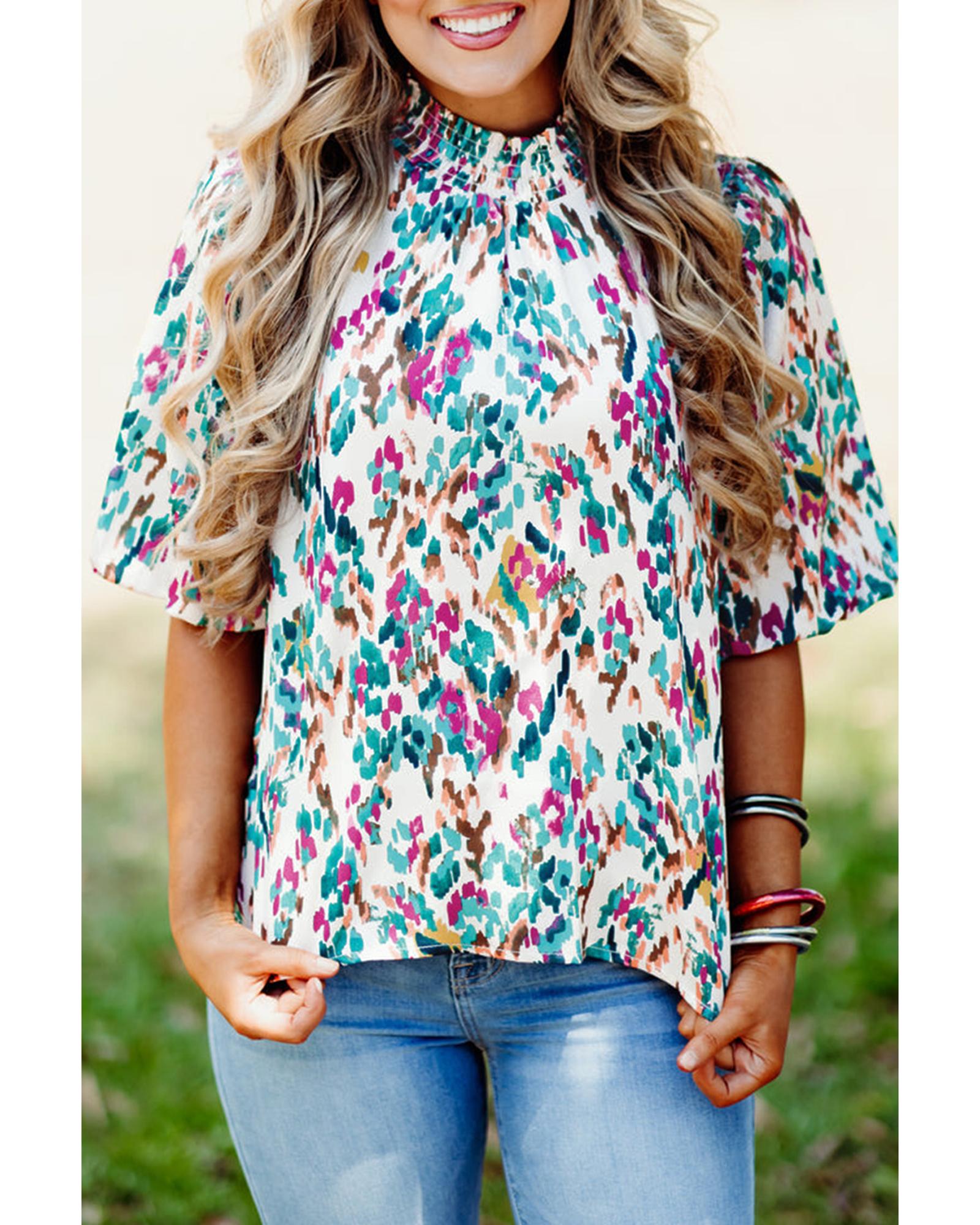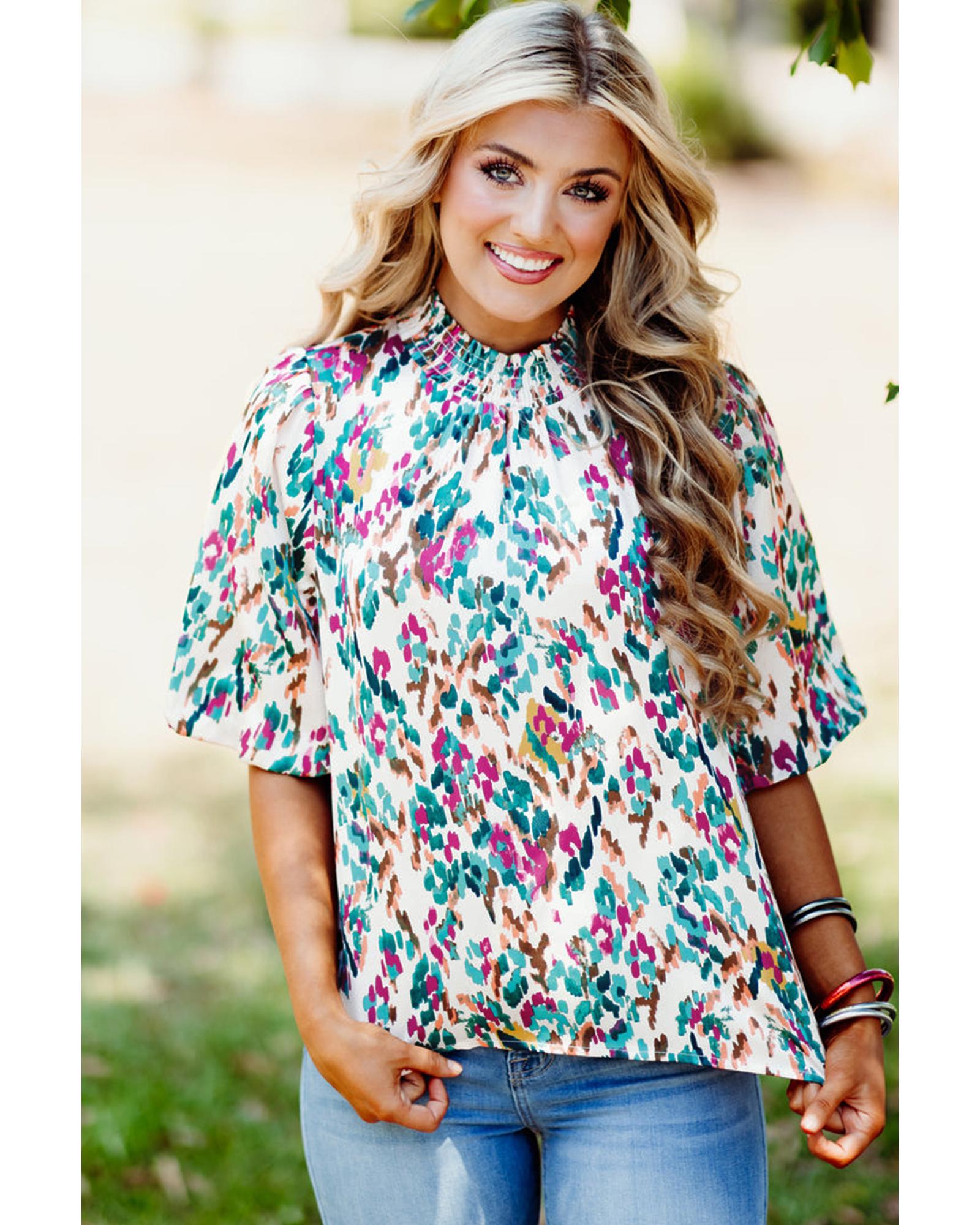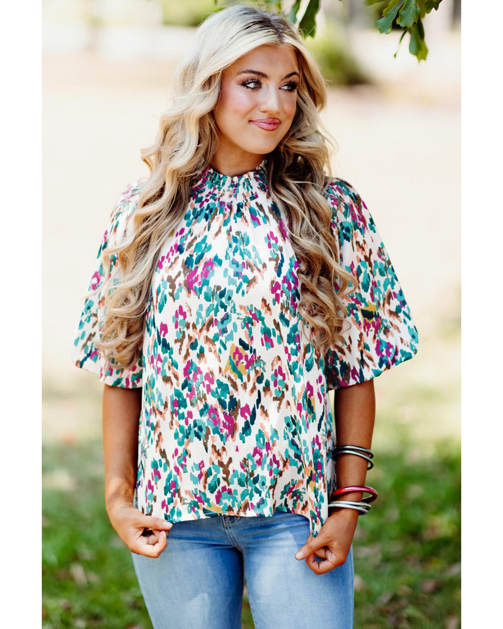 - 1 x Light Blue Abstract Print Puff Sleeve Mock Neck Blouse