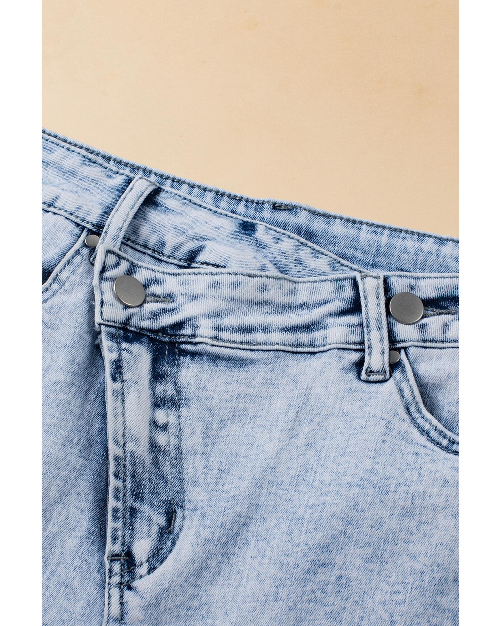 This pair of light blue acid wash denim shorts features a vintage-inspired design with crossed raw edges and edgy detailing. The crossed waist adds a fashionable touch, making these shorts perfect for casual outings, music festivals, or pairing with tees, tank tops, and crop tops for a trendy look.
