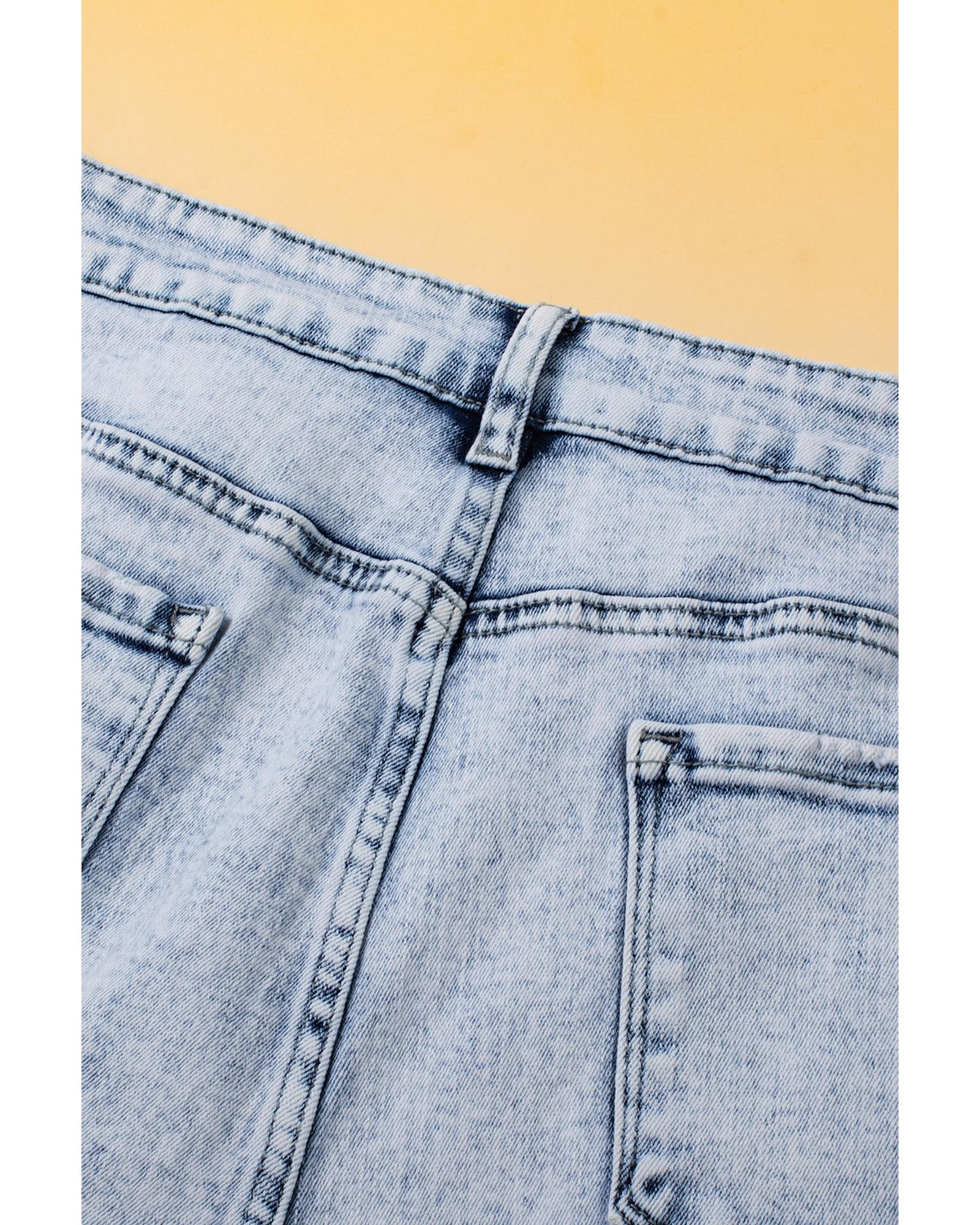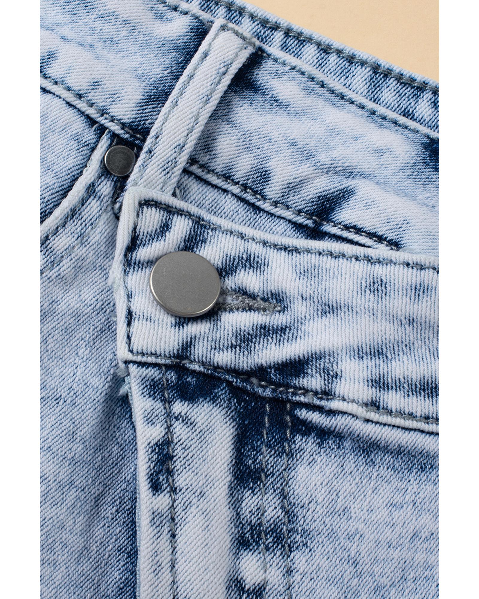 These denim shorts feature a light blue acid wash with a vintage-inspired look. The crossed waist design adds a fashionable and creative touch, while raw edge detailing provides an edgy, trendy appearance. Perfect for casual outings or music festivals, they pair well with tees, tank tops, and crop tops.