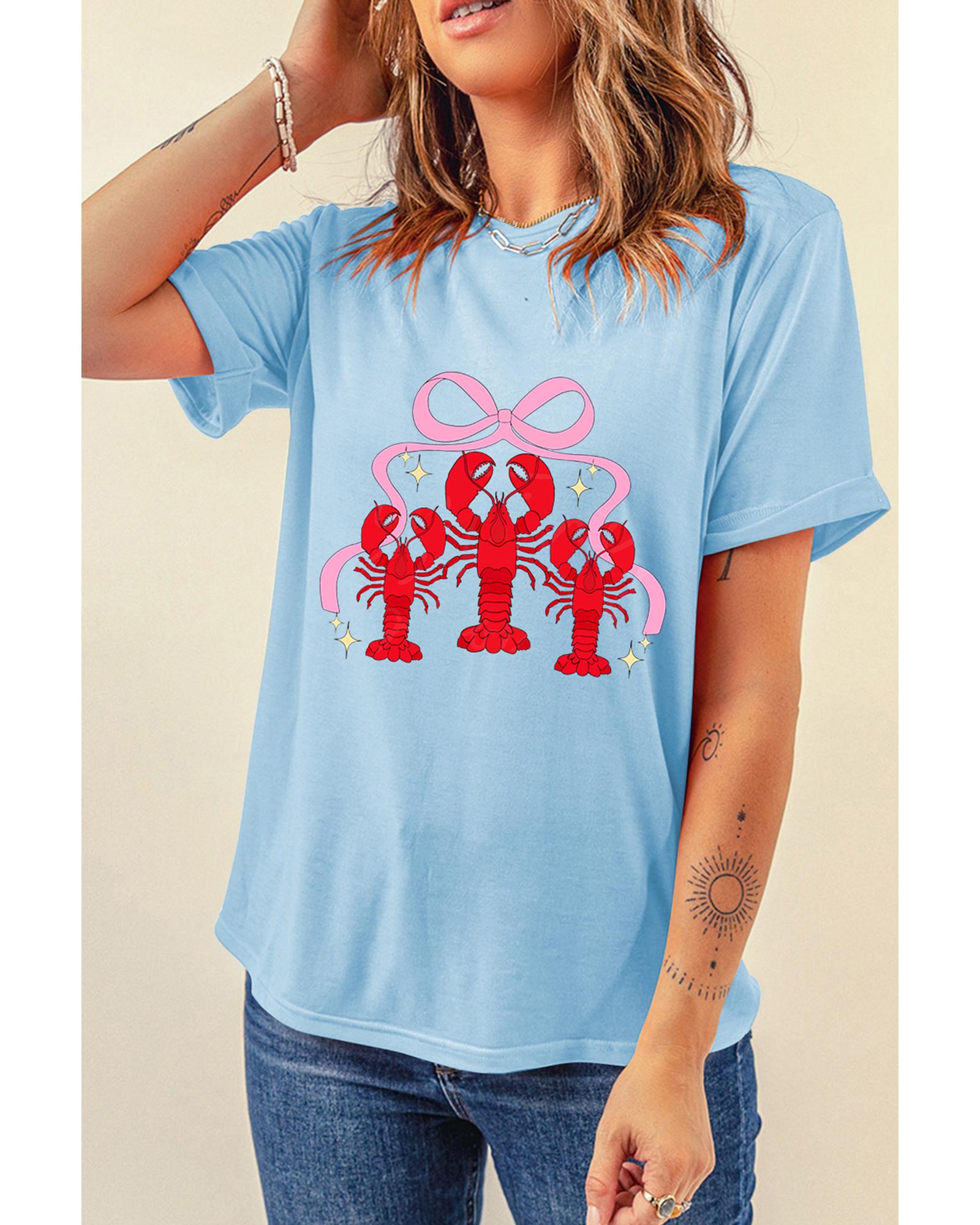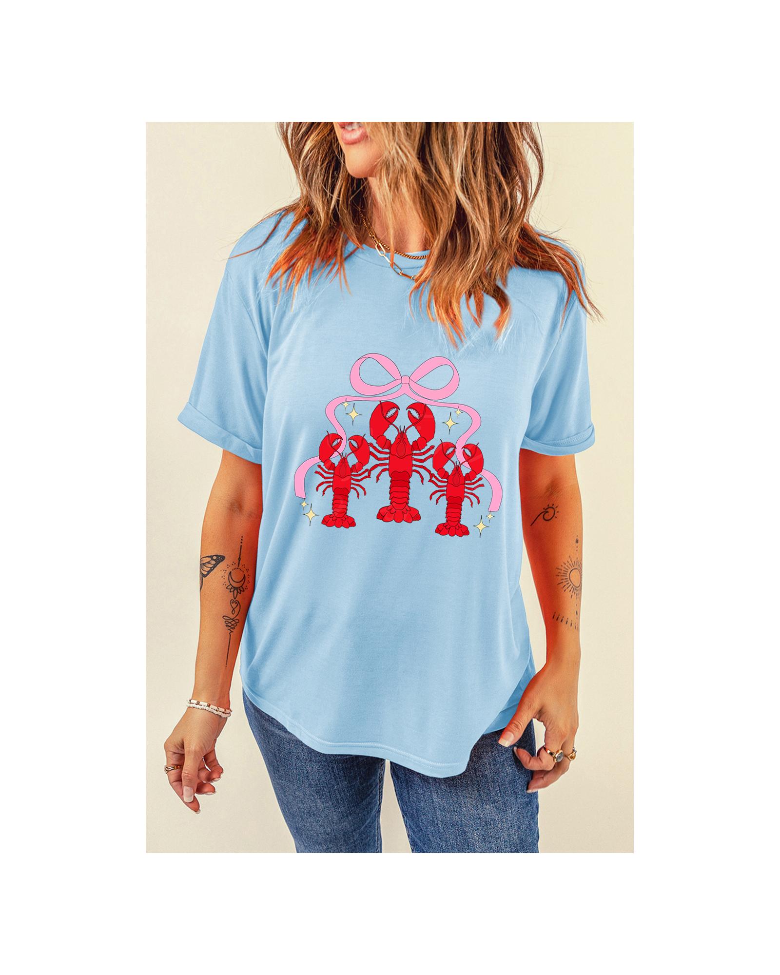 This light blue T-shirt features a vibrant crawfish and bowknot print, making it a stylish choice for seafood enthusiasts. Its relaxed fit and crew neck design ensure comfortable wear throughout the day, while the soft, breathable fabric provides all-day comfort.