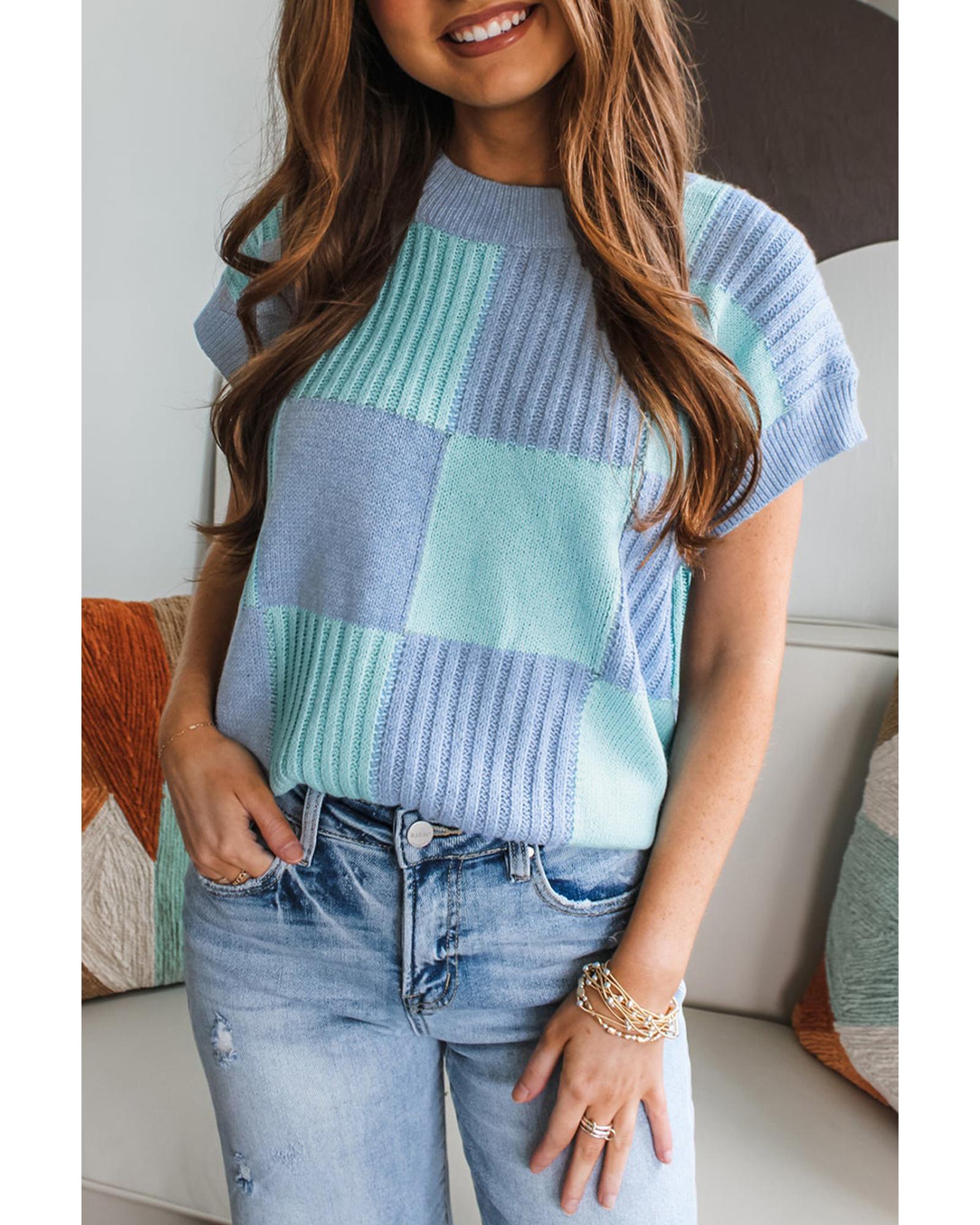 Light Blue Checkered Color Block Crew Neck Short Sleeve Sweater – L
