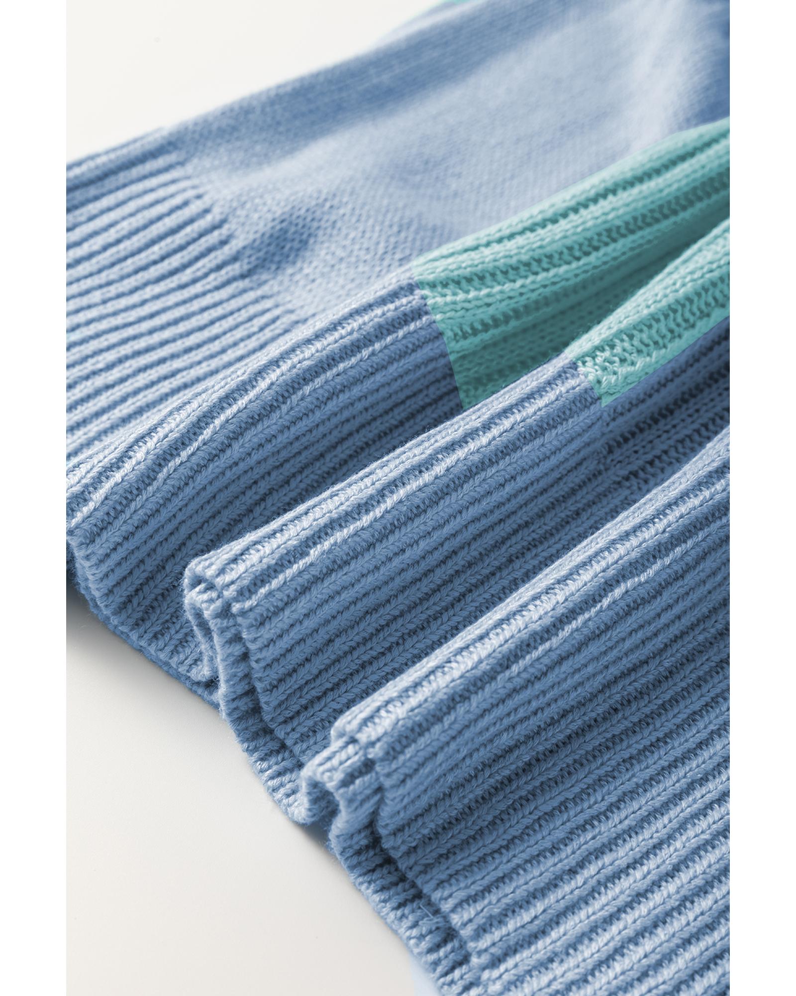 This light blue checkered color block crew neck sweater offers a casual and stylish look with a comfortable fit. Designed with a trendy fitted silhouette, it is suitable for various casual occasions and can be easily paired with different outfits.