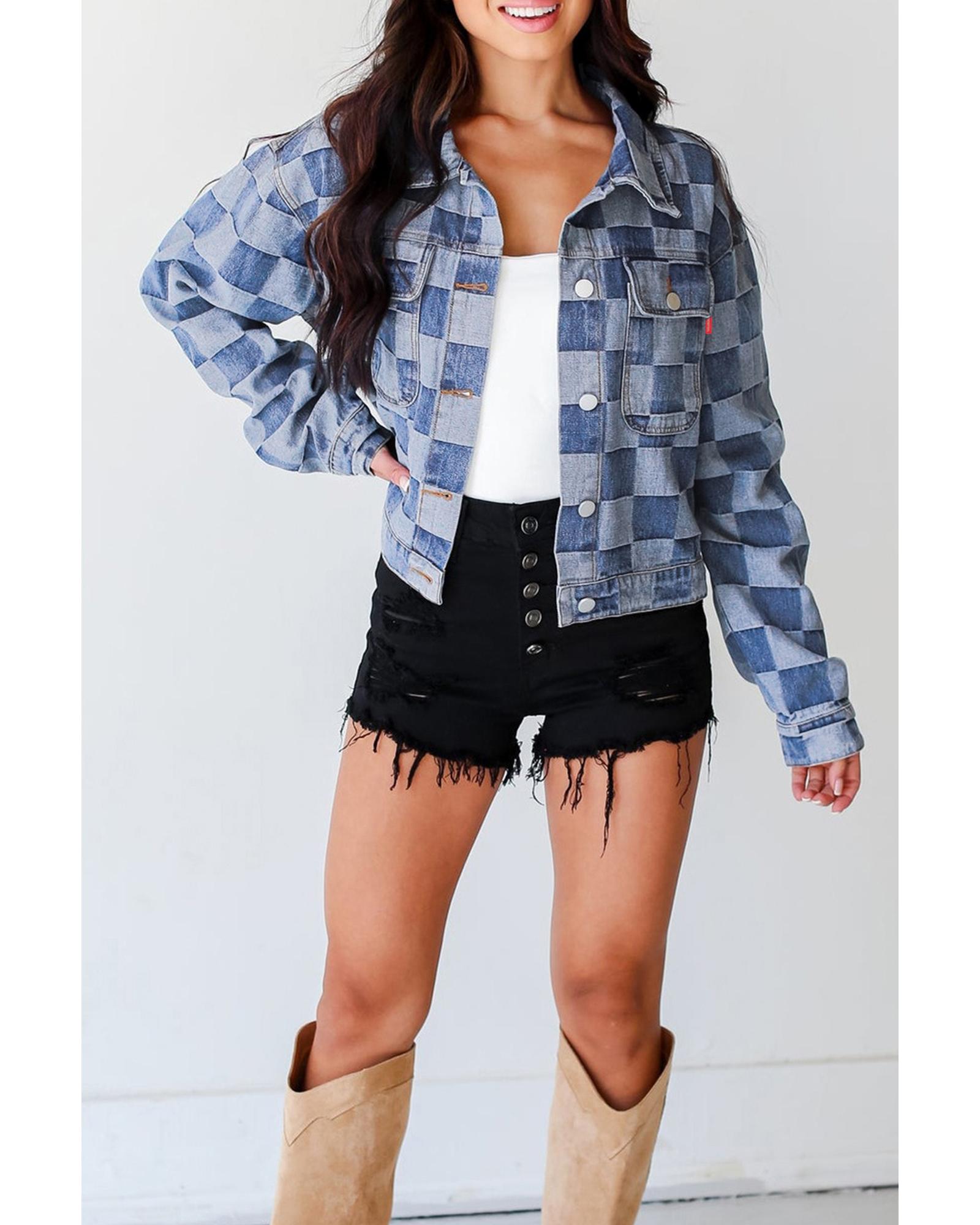 This denim jacket features a stylish checkered patchwork design in a light blue color, combining classic denim with a modern pattern. It offers a trendy fitted look suitable for casual and laid-back outfits, making it a versatile addition to your wardrobe.