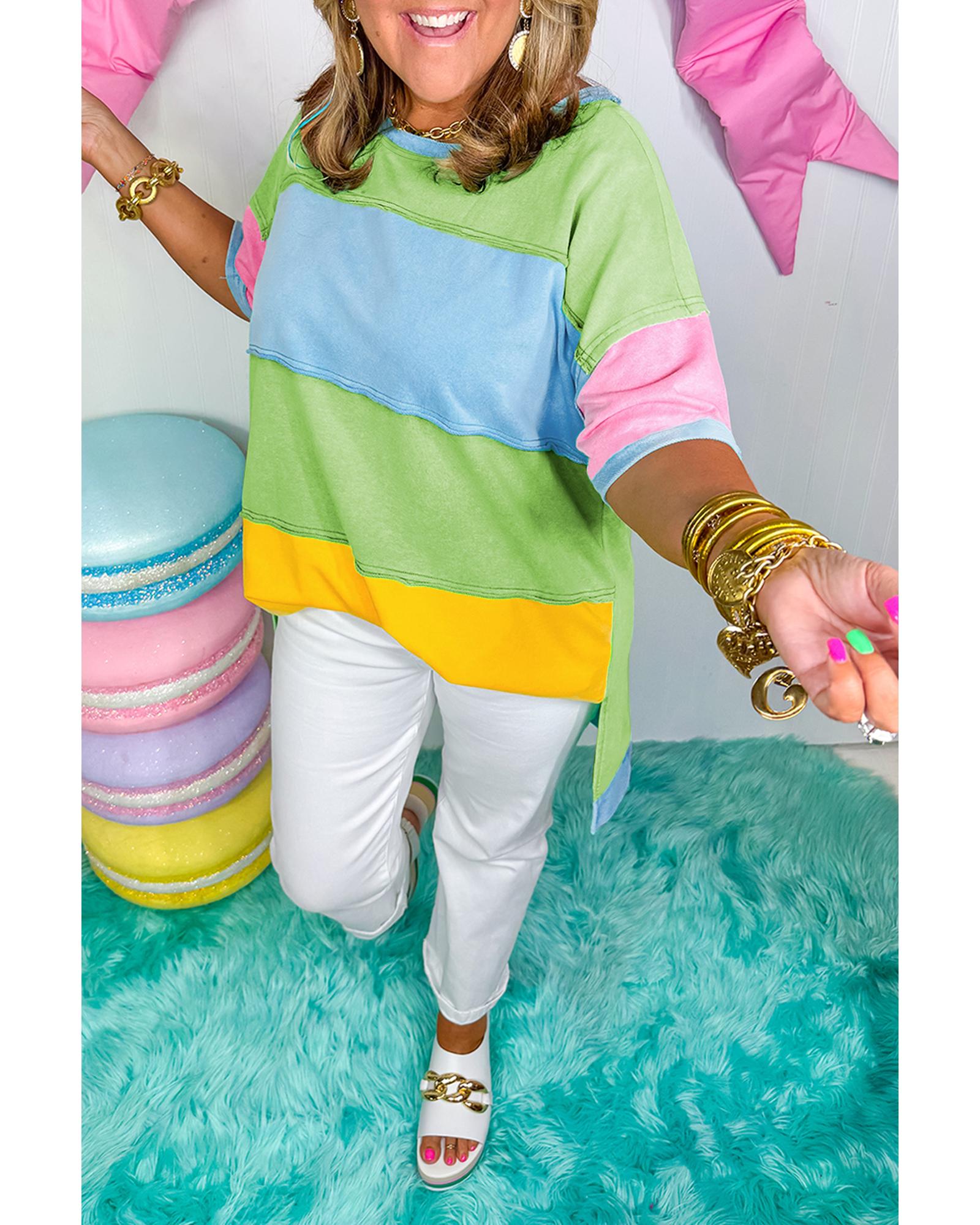 Light Blue Color Block Exposed Seam Patchwork Plus Size T Shirt – 2X