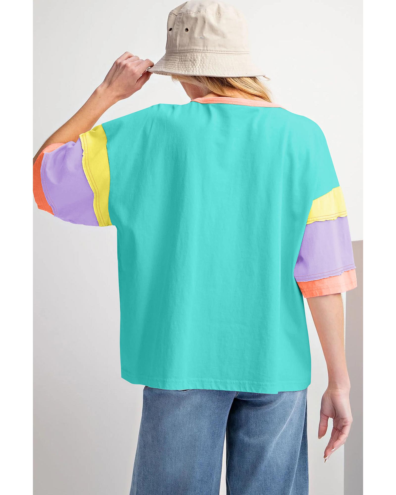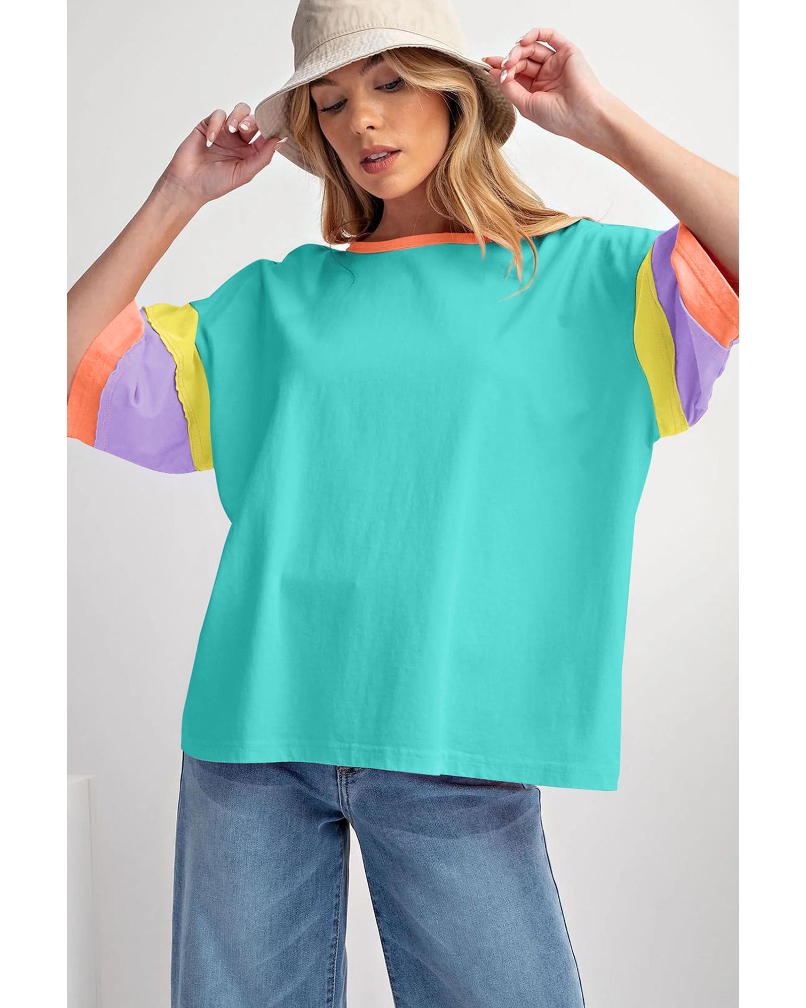 This light blue oversized top features a stylish color block stitching design on the sleeves and a round neckline. Its relaxed fit and dropped shoulders provide a comfortable and trendy look, making it suitable for casual wear. The raw cut stitching details add a unique touch to the overall design.