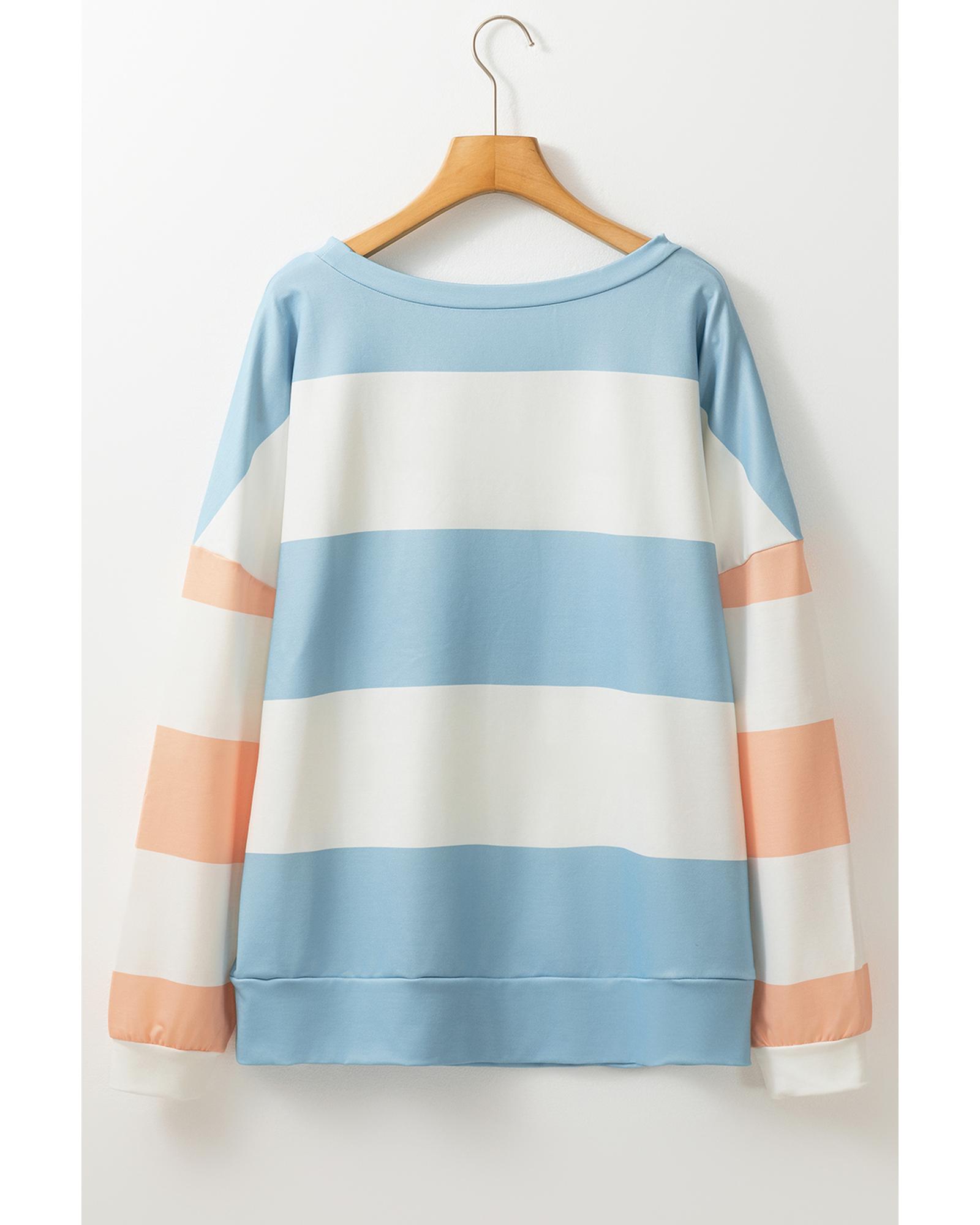 This light blue colorblock striped long sleeve top features a casual yet stylish silhouette with a modern aesthetic. Its trendy drop shoulder design and bold colorblock stripes make it a versatile addition to any wardrobe, suitable for various occasions and seasons.
